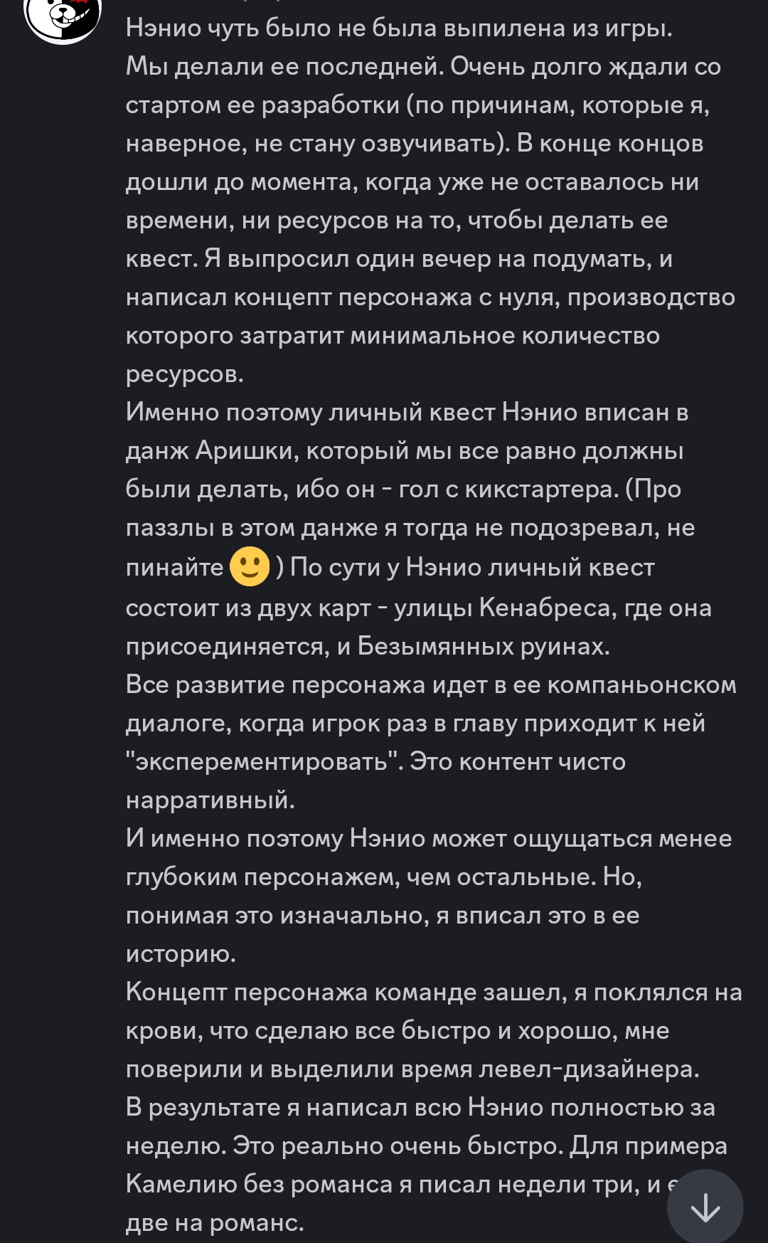 >>50512513 >И у большинства из этих 500 всего две фразы, но даже в них умудряются про свою АБВГДшность заикнуться в разговоре Большинство и не заикается, там че-то около 10 персонажей на всю игру, если не меньше. Может чуть больше 14 или 15 на 500 персонажей.