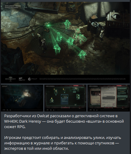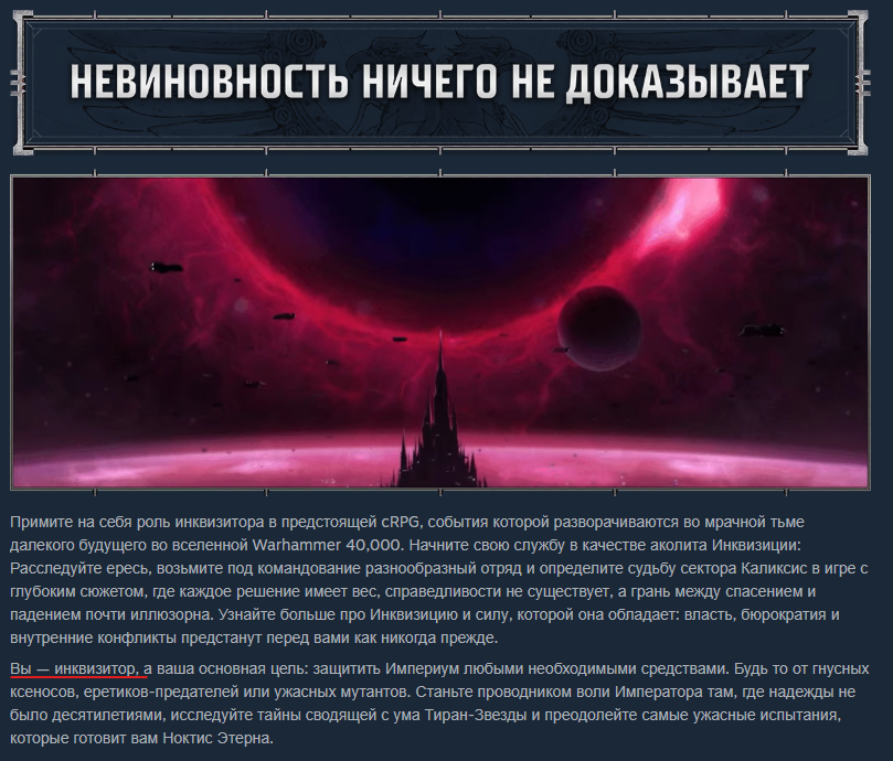 Warhammer 40,000: Dark Heresy Ещё одна crpg от совокотов по Warhammer 40k. Примите на себя роль инквизитора в предстоящей cRPG, события которой разворачиваются во мрачной тьме далекого будущего во вселенной Warhammer 40,000. Начните свою службу в качестве аколита Инквизиции: Расследуйте ересь, возьмите под командование разнообразный отряд и определите судьбу сектора Каликсис в игре с глубоким сюжетом, где каждое решение имеет вес, справедливости не существует, а грань между спасением и падением почти иллюзорна. Узнайте больше про Инквизицию и силу, которой она обладает: власть, бюрократия и внутренние конфликты предстанут перед вами как никогда прежде. Вы — инквизитор, а ваша основная цель: защитить Империум любыми необходимыми средствами. Будь то от гнусных ксеносов, еретиков-предателей или ужасных мутантов. Станьте проводником воли Императора там, где надежды не было десятилетиями, исследуйте тайны сводящей с ума Тиран-Звезды и преодолейте самые ужасные испытания, которые готовит вам Ноктис Этерна.