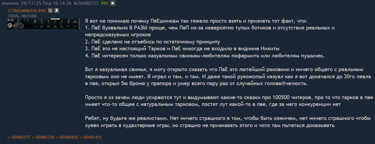 >>50491416 → >По сути тарков просто сам себя перерос. Это игра была расчитана на 5-10к онлайна в пике, на крайне малую аудиторию тактикульных сорокалетних скуфов, и должна была игратся в рамках страрого завода, старого леса, старой развязки, резерва и старой тамоги. Двачую. Напомню что улицы изначально были такими в первый свой вайп и тоже игрались с хуевым фпс, но буба еще больше расширил их, чтобы они вообще стали неиграбельны.