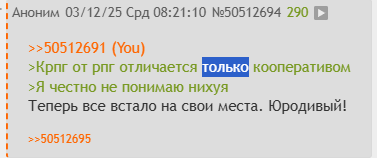 >>50510647 >Шахматы по переписке, текстовые рпг, морской бой. И че ты этим пытаешься опровергнуть? >Я их буквально разделял. Ты ниче не разделял потому что ты свою позицию не заявил. >Ты сам выдумал. Это следует из того что ты шахматы по переписке считаешь текстовой игрой, мол там в письмах текст это команды б2-б3. Если б2-б3 это текст, то игровой код это текст, а значит любая игра это текстовая игра. >Пора занять другую позицию, эту ты сам уже разнес и опростоволосился неоднократно. А ты понял мою позицию? В чем она заключается?