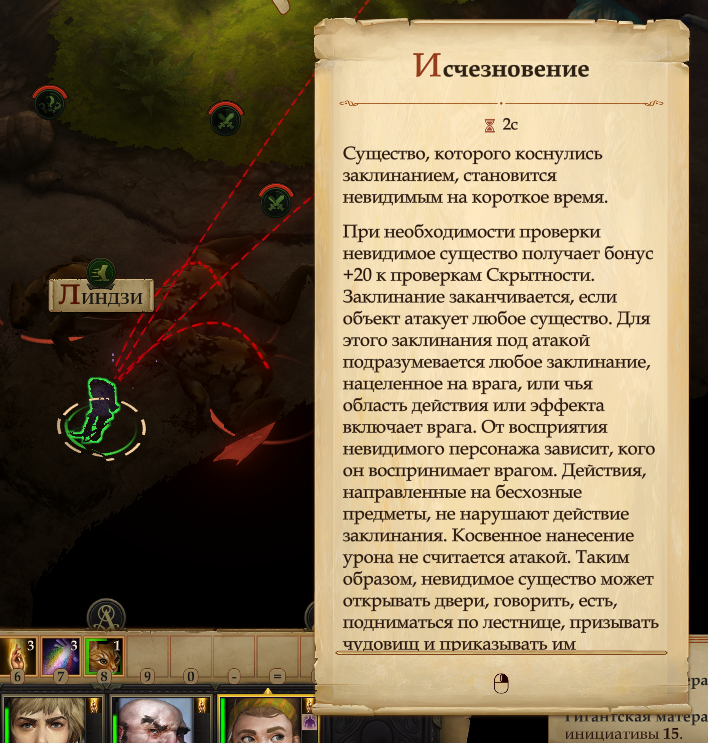 Линдзи 4 раза не может выбросить кубик больше 8 чтобы обезвредить ловушку. На пятый раз ловушка срабатывает - высирается паутина, которая не пропадает МИНУТ ПЯТЬ и полностью останавливает напарников А ещё очень доставило, что заклинание маспо увеличивается по длительности с уровнем, и так же не пропадает после боя минуты две, не давая нормально пройти