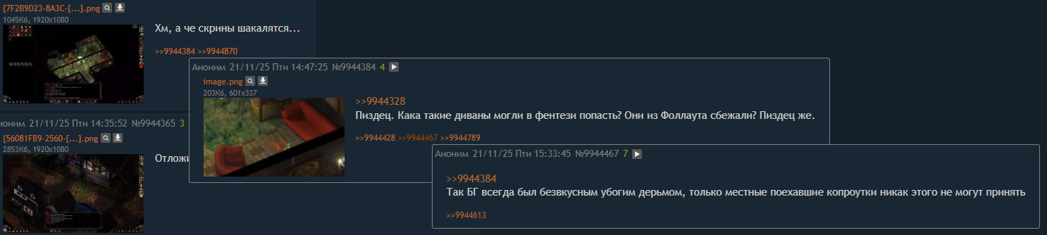 Ебало всех хайпожерных бочкошизов по всему интернету, которые внезапно выяснили что годами жрали и нахваливали гнойное дерьмо абсолютно поехавшего деда просто прекрасно. Давно не было такого мощного треска порвавшихся шаблонов. Особо достваляют вялые попуки про "не вся так однозначно" итд, при том что ларианы уже 4й раз пилят одно и ту же парашу, чуть меняя декорации. Заодно и стало ясно почему визарды отозвали лицензию у этих поехавших и канцельнули любые намеки на ДЛЦ - там уже натурально клуб ебанатов собрался, скоро начнут жарить и жрать после работы отрезанные друг у друга в поддержку толерантности писюны. Такой градус накала глубинной соевой идиотии даже матерые калифорнийские жопотрахи вынести не смогли. Я считаю отличный каминг аут поехавшего деда и его фанатов пикрил.