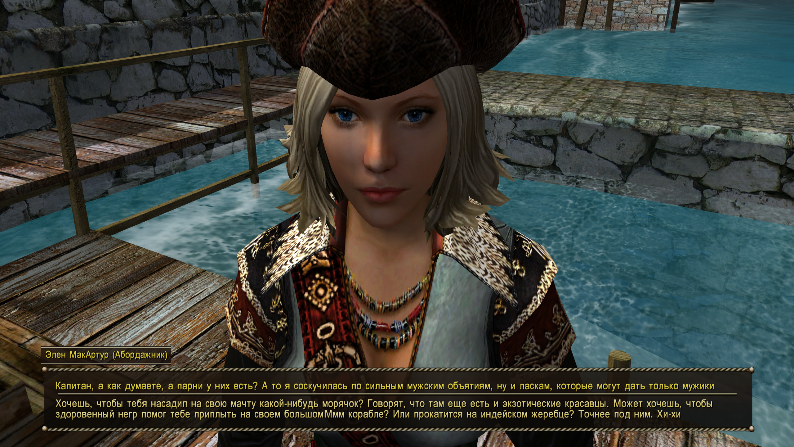 Агрх!!Я отрубил модом поднятие флага, нашел Элен, думаю а чего это не могу предложить ей жаркий секс. И тут на те, лол. Они там в принципе с другой планеты? Можно было в троем с Мэри придумать в каюте, в таверне. Или они двое, а я бы посмотрел. Но, блять. Диалог кстати имеет и развитие дальше.