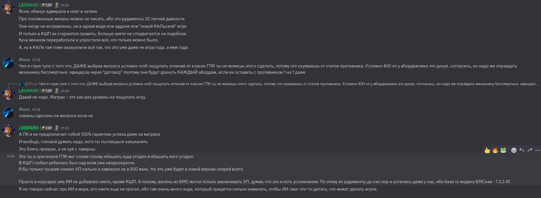 Кто тут трясётся за роудмапу к ККП и наезжает на Гирькина, уймитесь уже нахуй, петуши дырявые. Я как альфатестер уже катаю в свежий патчик, и там всё уже спижжено у Джейрубы: интерфейсы, новое управление персонажем, новые кораблики, и добавлена новая куча всего. Я взял себе новый перк на старте и нагибаю всех теперь в море как адмирал на Бусти