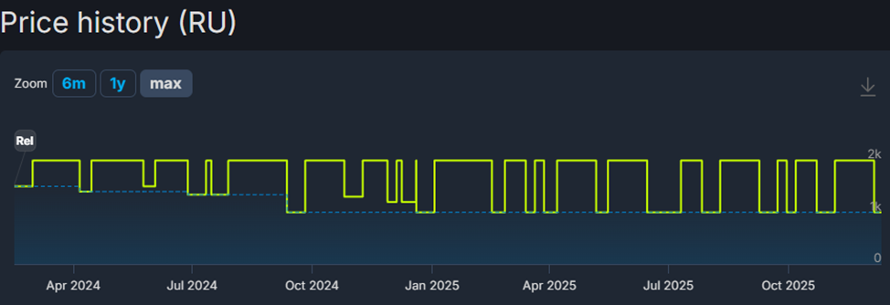 Давай начнем с самого больного для тебя – цены. И откроем мы СтимДБ. Что мы видим? Правильно, почти 45% всего времени Легендарка продается по цене в 1000 рублей. Много это или мало для 2025 года? Давай, думай, подсказывай. Ещё приплюсуем комиссию Стима (30%) и банковские транзакции. Зарплату команде платить надо и налоги с неё? Ебал? Сосал?