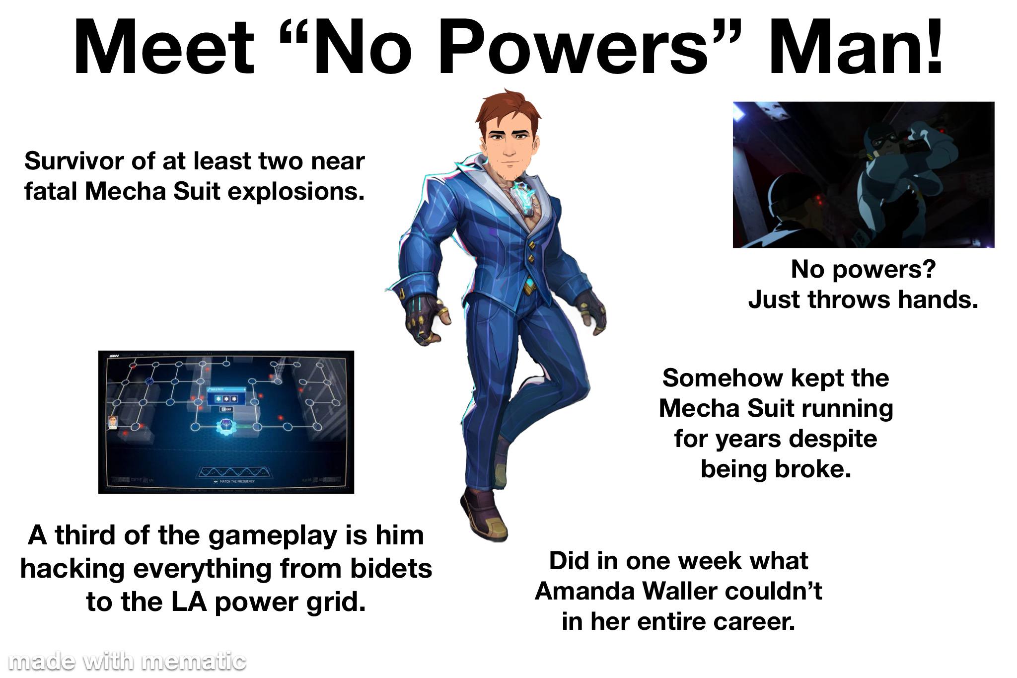 Почему мехабич вообще считается за супергероя, когда его робот ебется в хлам любым супером? Где рост персонажа на протяжении всей игры, почему мы начали как мехабич, а закончили как более слабый мехабич которому нужна КОМАНДНАЯ РАБОТА чтобы кого-то отпинать?
