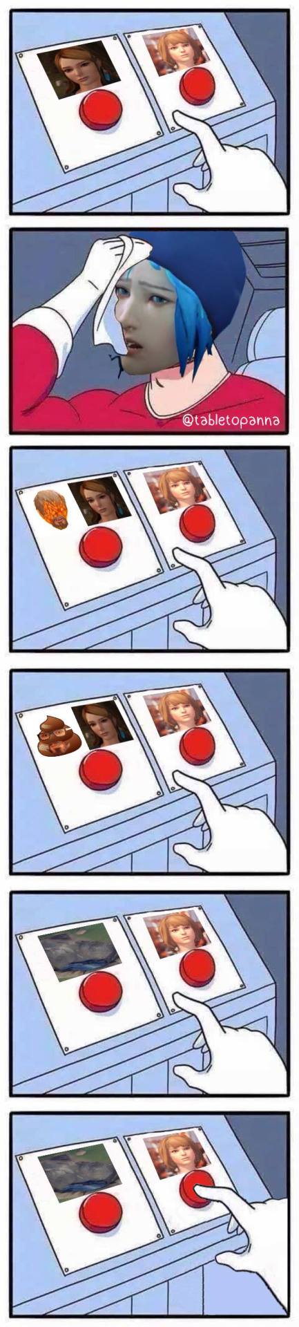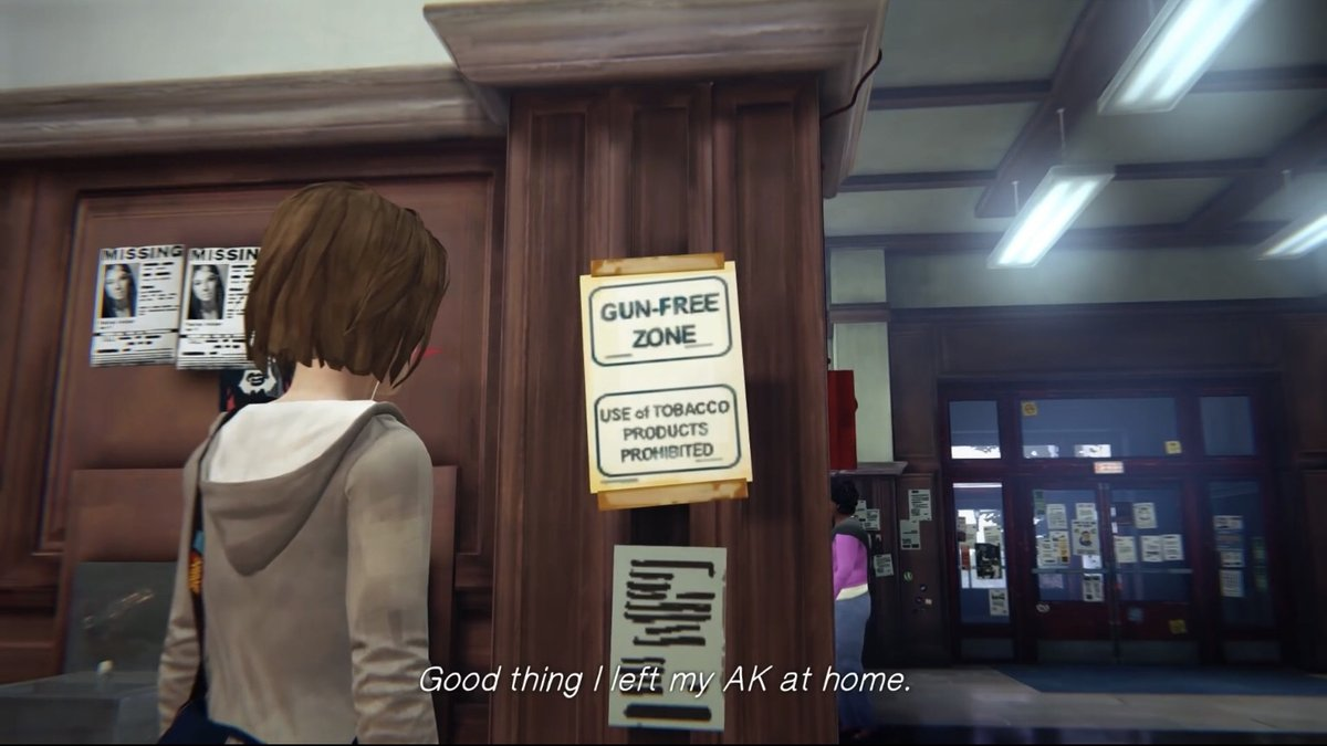 Ну вот мне не очень нравится что они начали штамповать идеи из игры в игру, то есть я понимаю там в предыдущей игре был шторм тоже, и убийство лучшей подруги, типа это была такая метаирония на первую игру, ок. Но бля опять "шторм" (пожар, один хер), опять "невозможный выбор", всё одно и тоже млять, нахуя? Во второй игре была другая формула, в приквеле тоже, в цветах тоже. А тут уже третья игра и всё одно и тоже, задрало. Могли бы чот новое придумать. Я ещё после предыдущей игры вот эту ждал, потому что думал что ну всё, формулу первой повторили, теперь надо что-то новое придумывать для следующей части, но хер, лол.