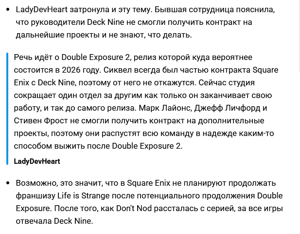 Ну и в качестве вишенки на торте - то, о чём я и говорю >Сотрудникам иногда приходилось работать по 70-80 часов в неделю >Переработки во многом были связаны с давлением Square Enix, которая ставила жёсткие сроки и старалась как можно сильнее сократить бюджет >Работники жаловались на низкие зарплаты, трудности с карьерным ростом и бездействие руководства в отношении случаев токсичного поведения >Сотрудники Deck Nine винили в сложившейся ситуации руководителей самой студии