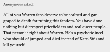 Кому нужна чрезвычайно хуево написаная история о двух педовках которые в обеих концовках, особенно в каноничной, угандошивают целую кучу людей просто так, ничему не учатся и не делают выводов, а синюшная свинья на полном серьёзе винит во всём окружающих. Или чрезвычайно хуево написаная история про двух латентных фуррипидоров-мексеканцев без сил. Или про аутиста слизаного прямиком с Легиона который типо дохуя телепат. Или про двух сестёр один из которых безопасный для маркетинга ЖвМ трансуходебил, у которых сила... Видеть цвет ауры окружающих.