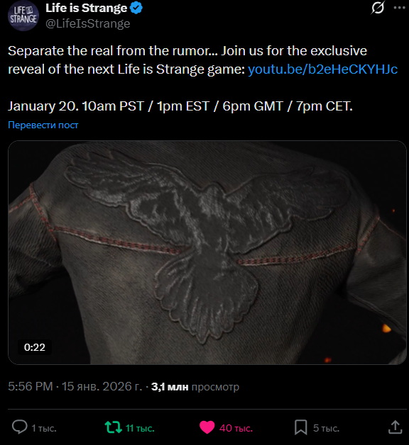 Страницу Life is Strange: Reunion на сайте рейтингового агентства PEGI заметили вечером 8 января. Помимо возрастного рейтинга «PEGI 16» и неверной даты релиза, указывающей на уже прошедший 2025 год, на странице есть синопсис сюжета Reunion. Согласно описанию, в игре должна вернуться Хлоя Прайс, которой нужна помощь Макс Колфилд, однако последняя уже разбирается с другим кризисом и пытается предотвратить пожар, который уничтожит университет через три дня.