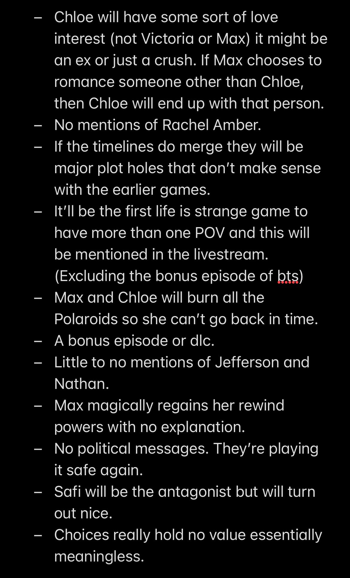 Поэтому я бы сделал ставку что они запилят третью новую концовку в этом сериале - Макс настолько охуеет от того как она порвала время (после кошмара) и её так заебали все эти бинарные выборы за весь сюжет, что она буквально порвёт время и пространство на две линии (как в Дабл Экспоужар), и мы увидим сразу две концовки, мб одна за другой, а мб даже одновременно в сплит-скрине, одну где погибает Хлоя, другую где Аркадия Бей, и в конце Макс эти две вселенные снова "слепит" вместе, и типа таким образом спасёт и Хлою, и Аркадию Бей. Но в конце твист какой-нибудь, что такая хуйня не прошла без последствий - и когда Макс и Хлоя пойдут домой - увидят у Хлои дома вторую Макс с ухмылкой, что как бы может быть намёком как на Макс которая просочилась из альтернативной вселенной, или же это ранний намёк на Сафи-шейпшифтера. Как-то так короче.