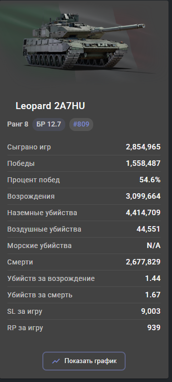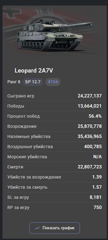 >>50517485 Ты же понимаешь что БВМ имеет топ количество игр? На нем сыграли почти в два раза больше игра чем на топ 2 месте по играм (а это 2а6), при этом на танке кд 1.31. Представь что бы показывал по стате этот танк если бы на нем не накатывали по 2кк игр в месяц пивные трапы. А представлять не надо, ты пример сам скинул, те же леопарды других наций, на которых играют по 200-300к игр.