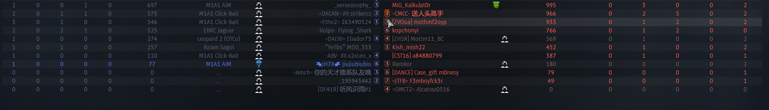 4 бой уже нас ебут в нулину. ВРаг смог взять аж 2 самолета. Которые сделали 0 фрагов. Особо ценнично я с ИТ90 обоссал СУ-30СМ на Х-38МЛ, тупо сбивая ракеты, пока он пытался убить меня. Его респ 800 очков, мой 90 очков. Я просто обоссал и унизил чухана.