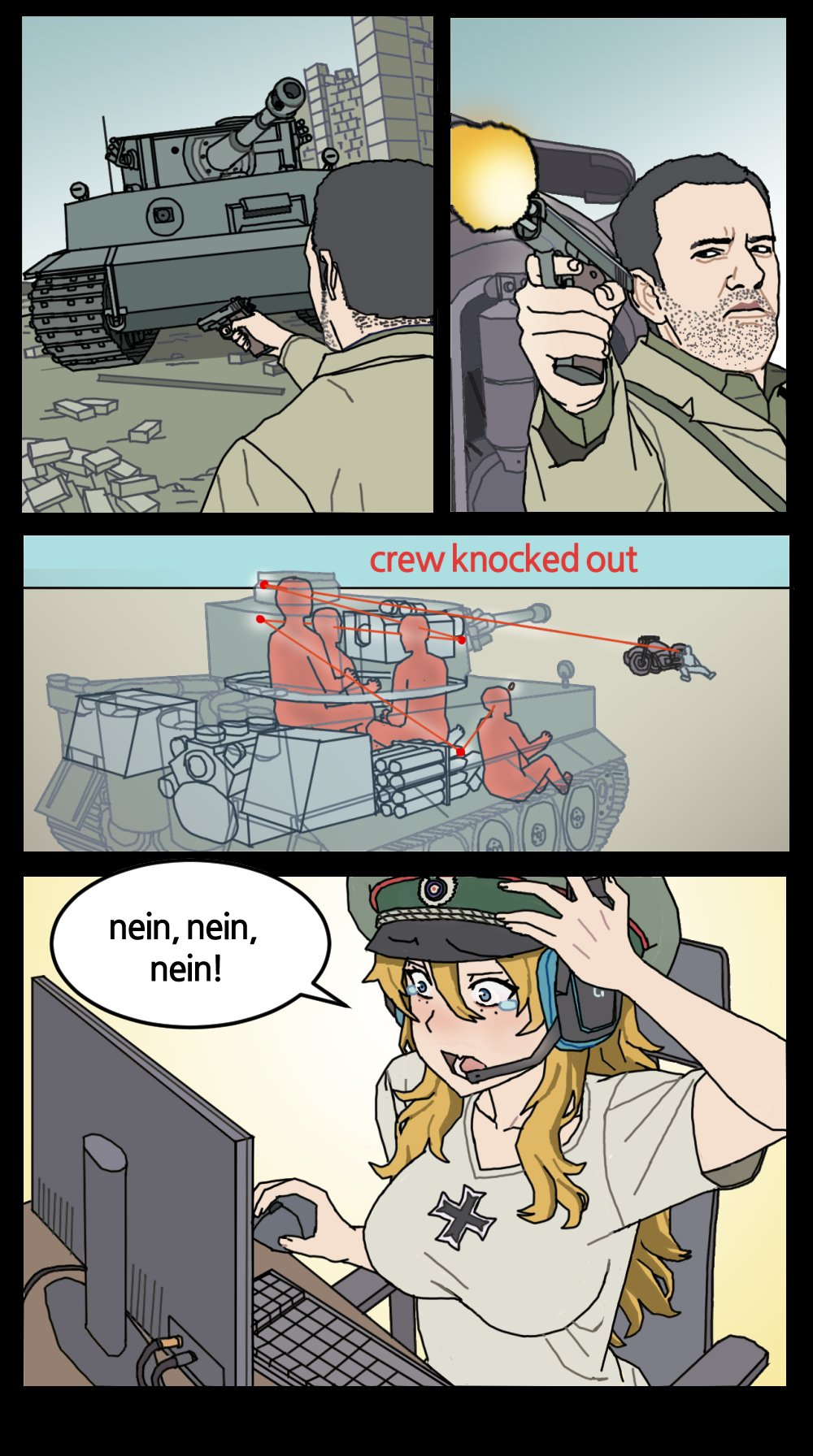 Да сука блять, куда стрелять этим мразям когда они стоят бортом? Наводчику осколками оторвало обе ноги и жопу - он при этом почувствовал легкое недомогание и без проблем произвел выстрел. Боеукладка разумеется не рванула, нахуй ей это надо, а карусель блять ПОЖЕЛТЕЛА сука, даже не почернела. Ну ебать его в рот нахуй!