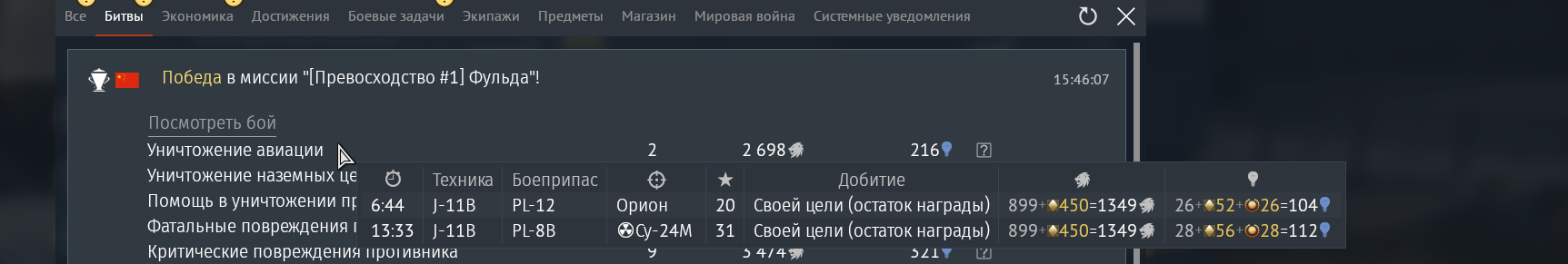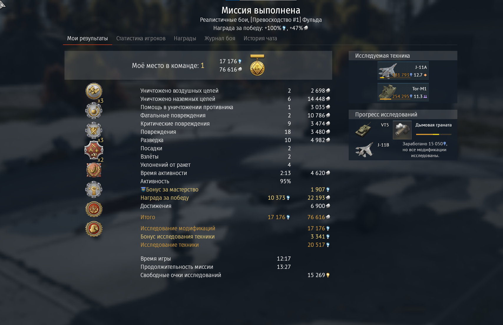 Итак, за 3 боя, по среднему значению 3 фрага от летки по наземке. 1 фраг в бою пока получается.