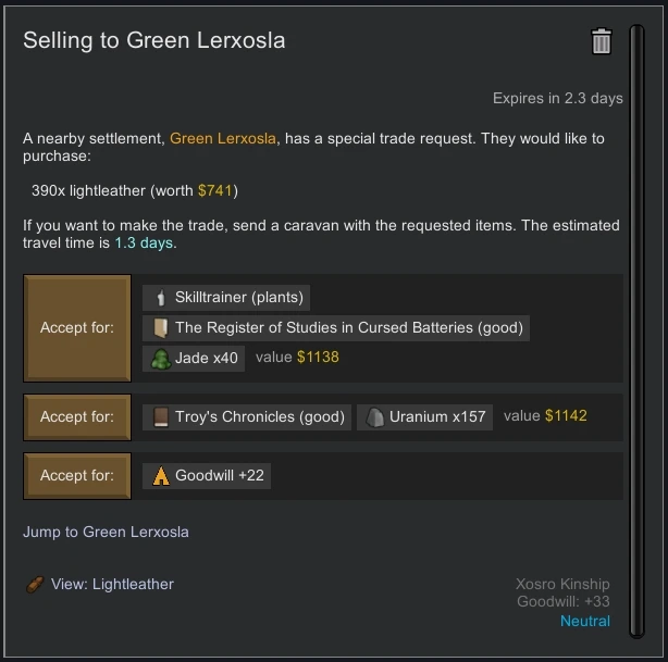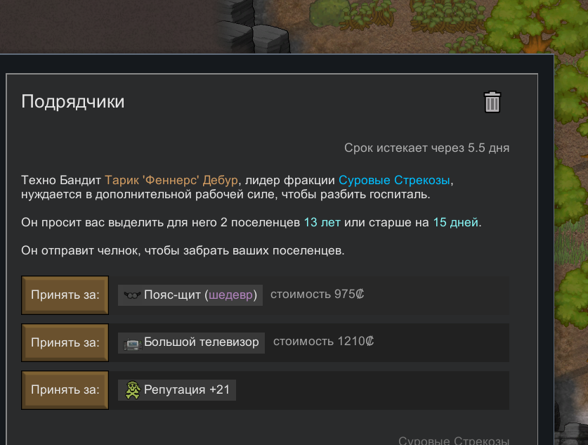 Самый помойный квест, ни разу не было резона его брать. Постоянно берут половину поселенцев на какое-то безумное время. Один раз кажись взял, и то, потому что запросили 1 пешку и она была в хуевом состоянии, скорее обуза.
