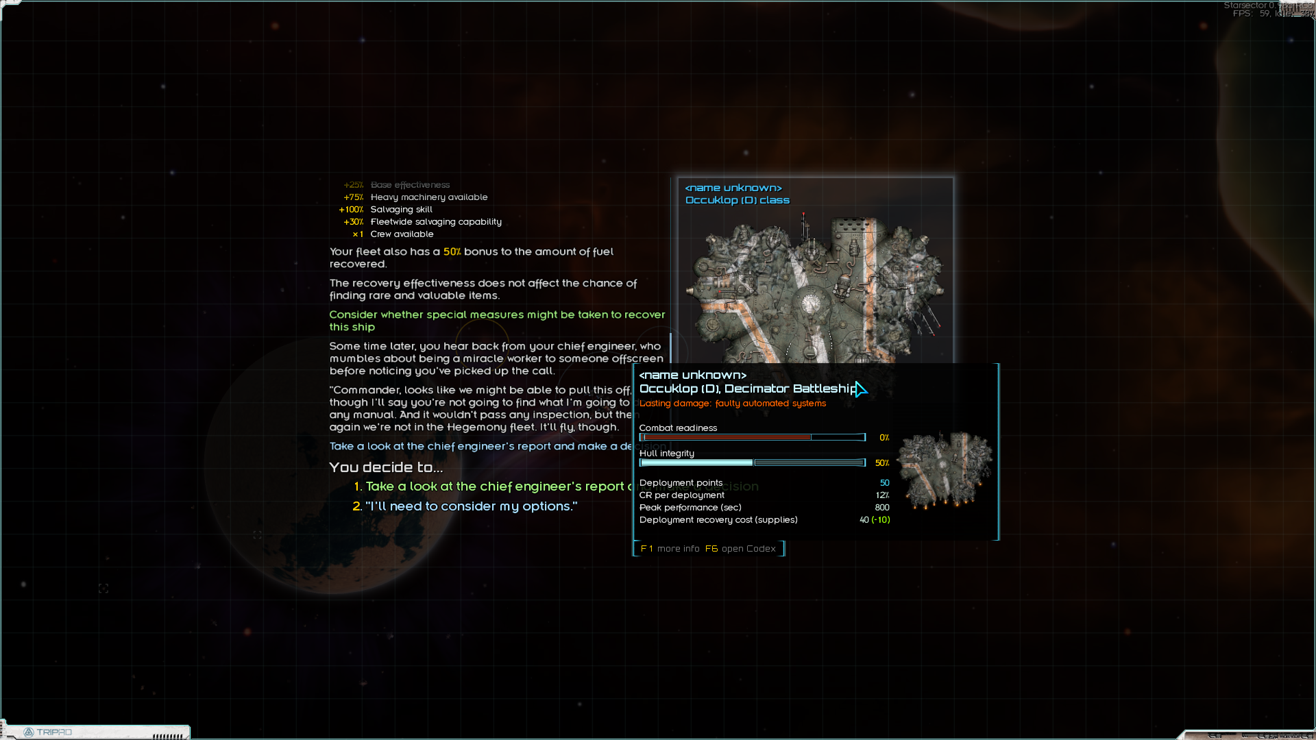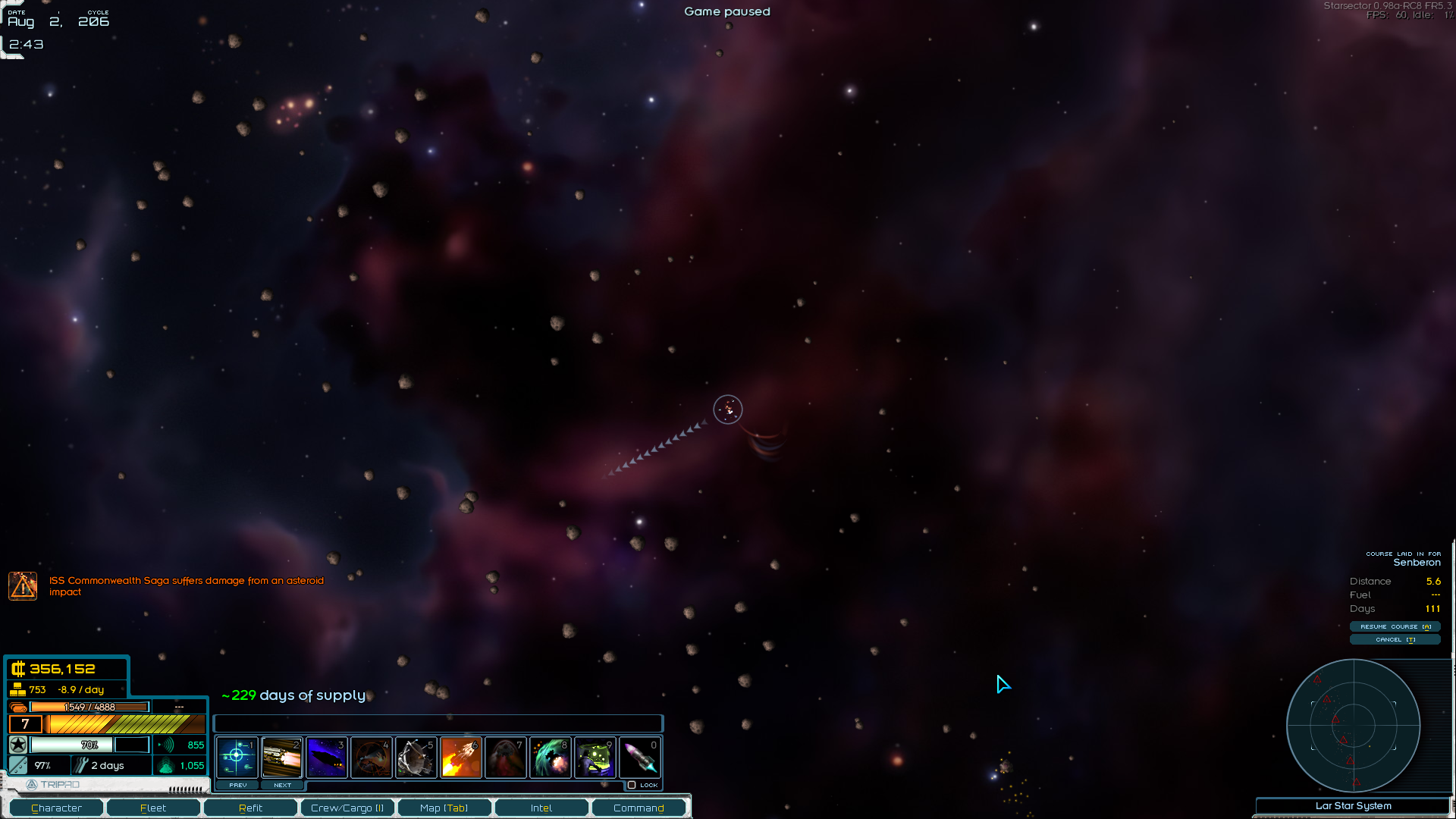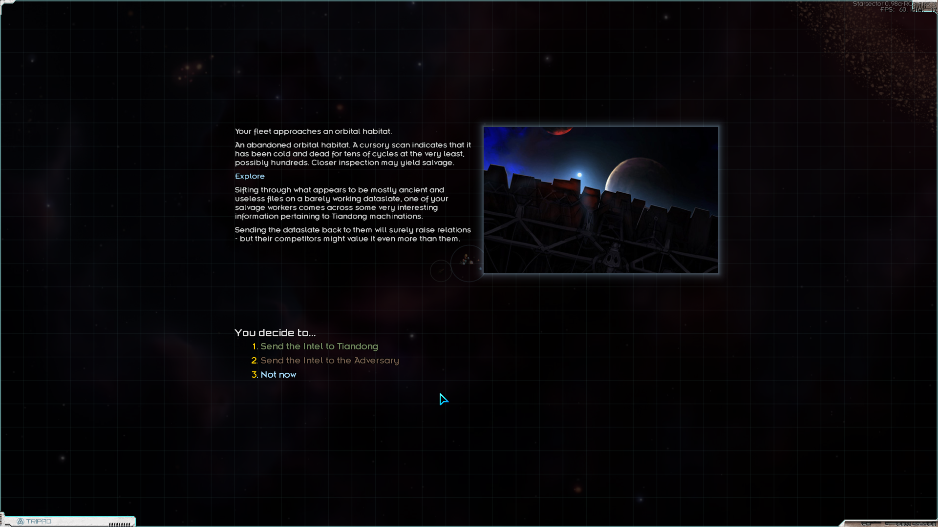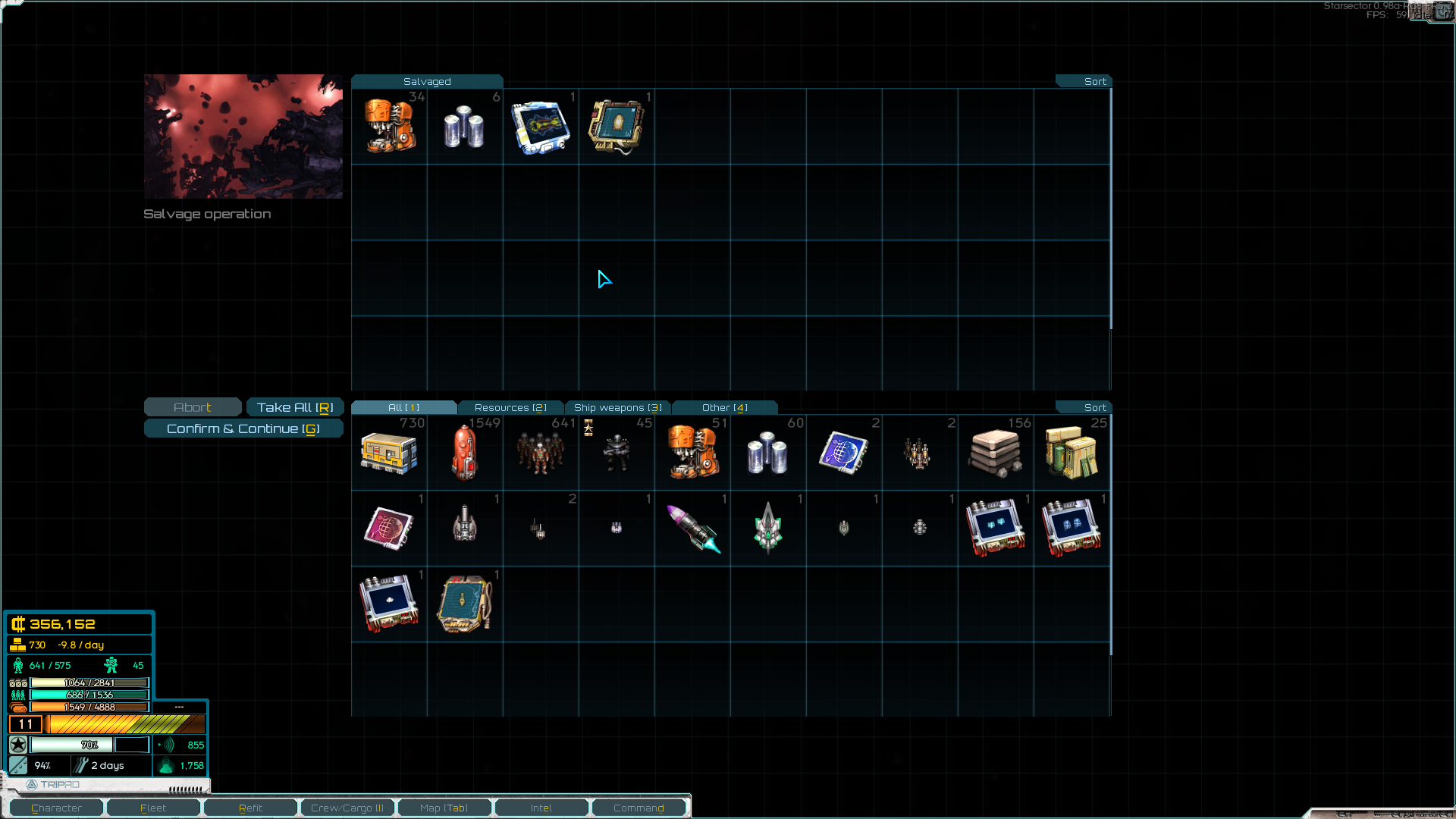 Алсо, наткнулся на клёвый эвент... Вроде из IndEvo - натыкаешься на мимохуя без топлива (или сапплаев - не помню) и меняешь оное на штук 5 стратегических ракет из мода. А на прощанье он тебе говорит - мол скоро через систему будет пиздохать метеоритный поток. Ну и действительно - огромный поток на большой скорости, так просто не увернёшься. Зато некоторые метеориты подсвечены и если их взрывать ракетами или просто раскалывать лбом - из них выпадают контейнеры. В трёх были обычные ресурсы и немного оружия, а вот в четвёртом - аж два чертежа.