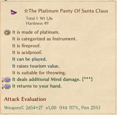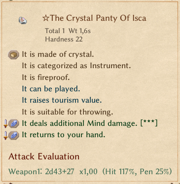 >>50606508 > условно качество. У шмоток не замечал. Там рандомные названия вроде катана адского разрывания ануса. У предметов мебели бывает "madam's favorite", но это вроде только на цену влияет.
