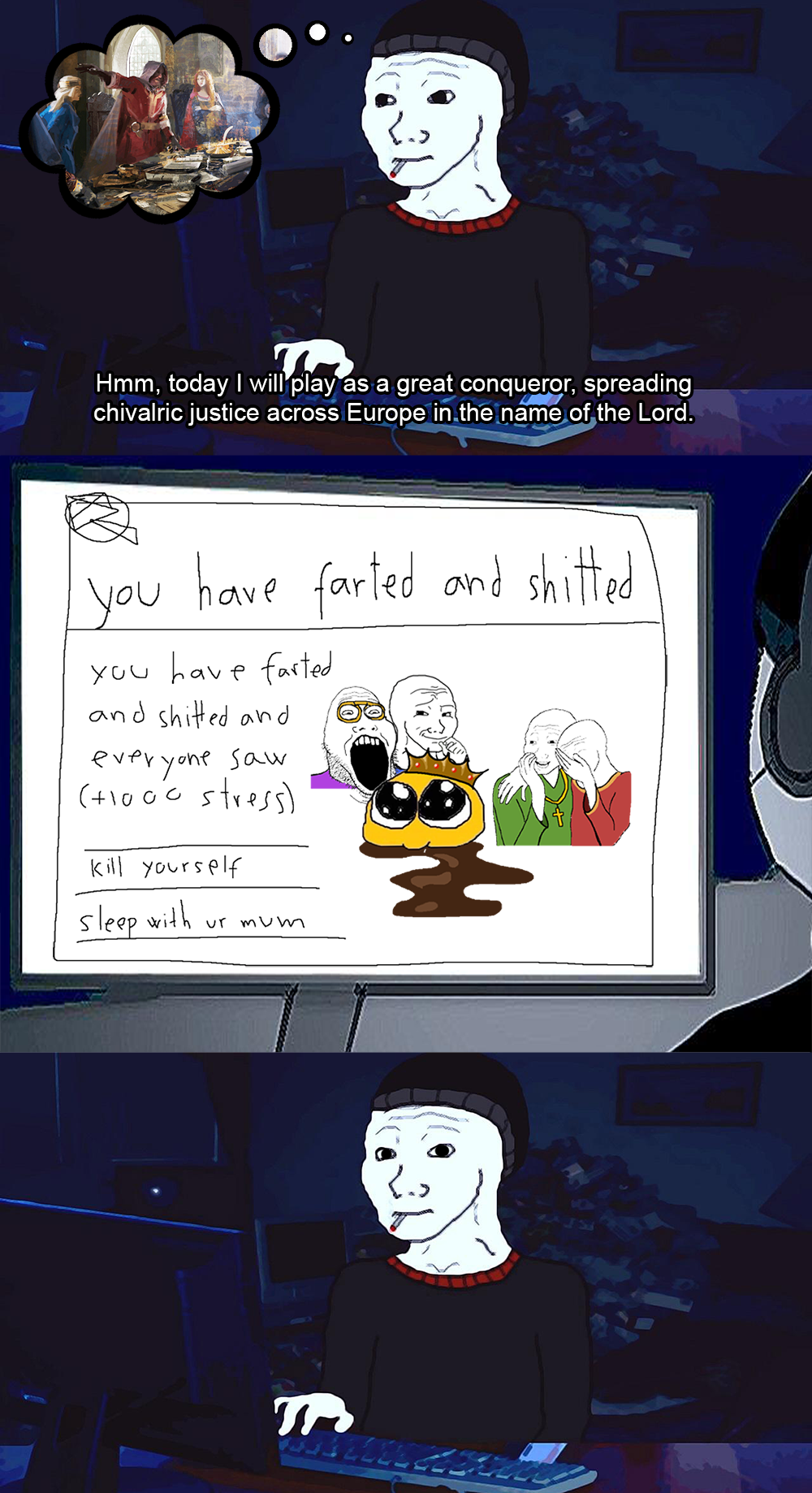 Вчера играл до утра и не мог никак стопнуться Ещё часик Ещё полчаса Уже 9, 10, 11 утра.. И тут всё наебнулось Экран замер, музыка не звучит, только курсор двигается А играю на Железеном Мужике и давно не делал страховый бекап сейв... Подождал минут 20-30 на случай, если отлагает Чуда не случилось Сегодня с большой неохотой запускал игру, потому что не хотел видеть сколько времени проебал в никуда, с какой войны начну А там засейвилось, хотя я перезагружал кнопкой на корпусе Чуда свершилось, Парадокс сила 💪