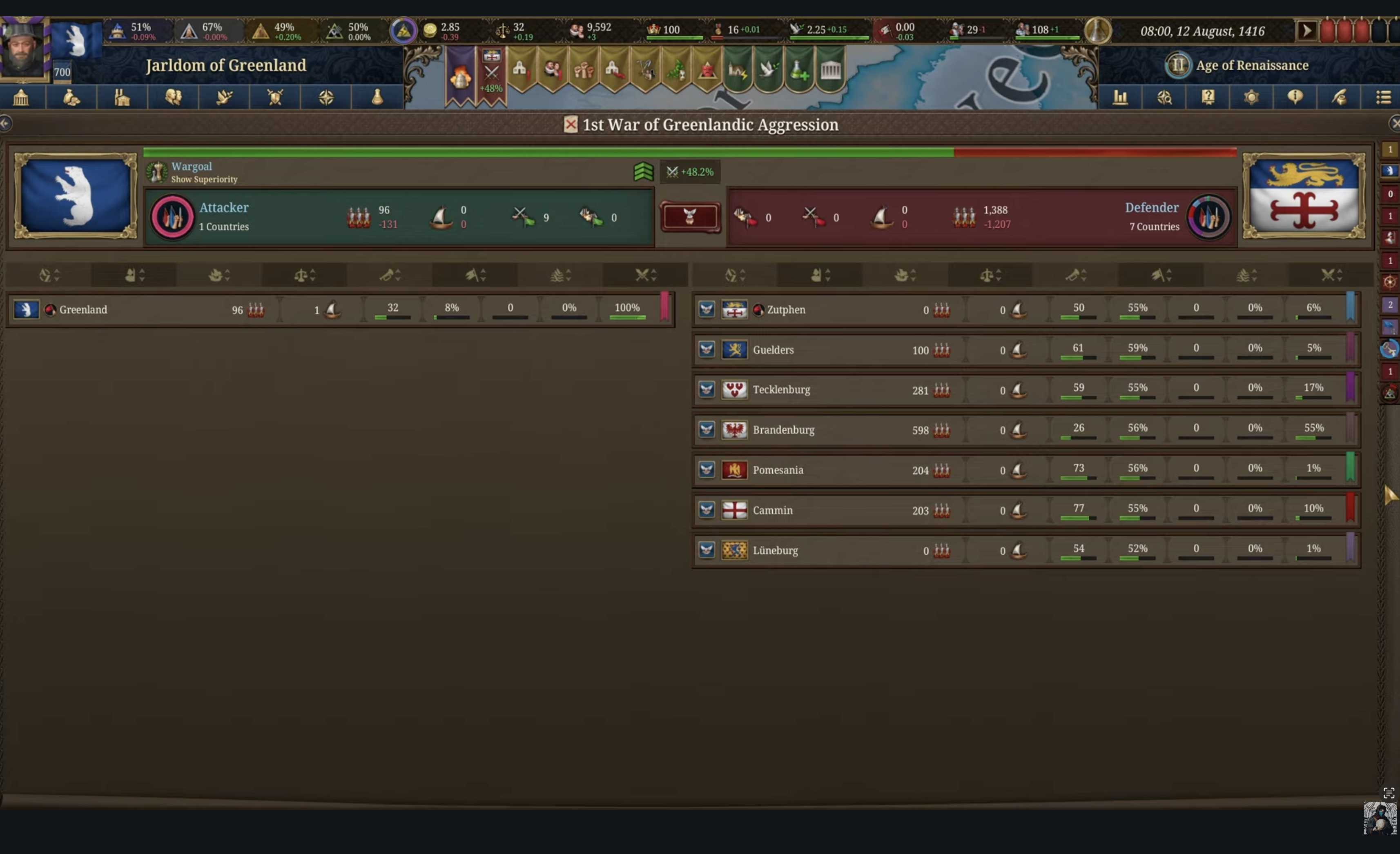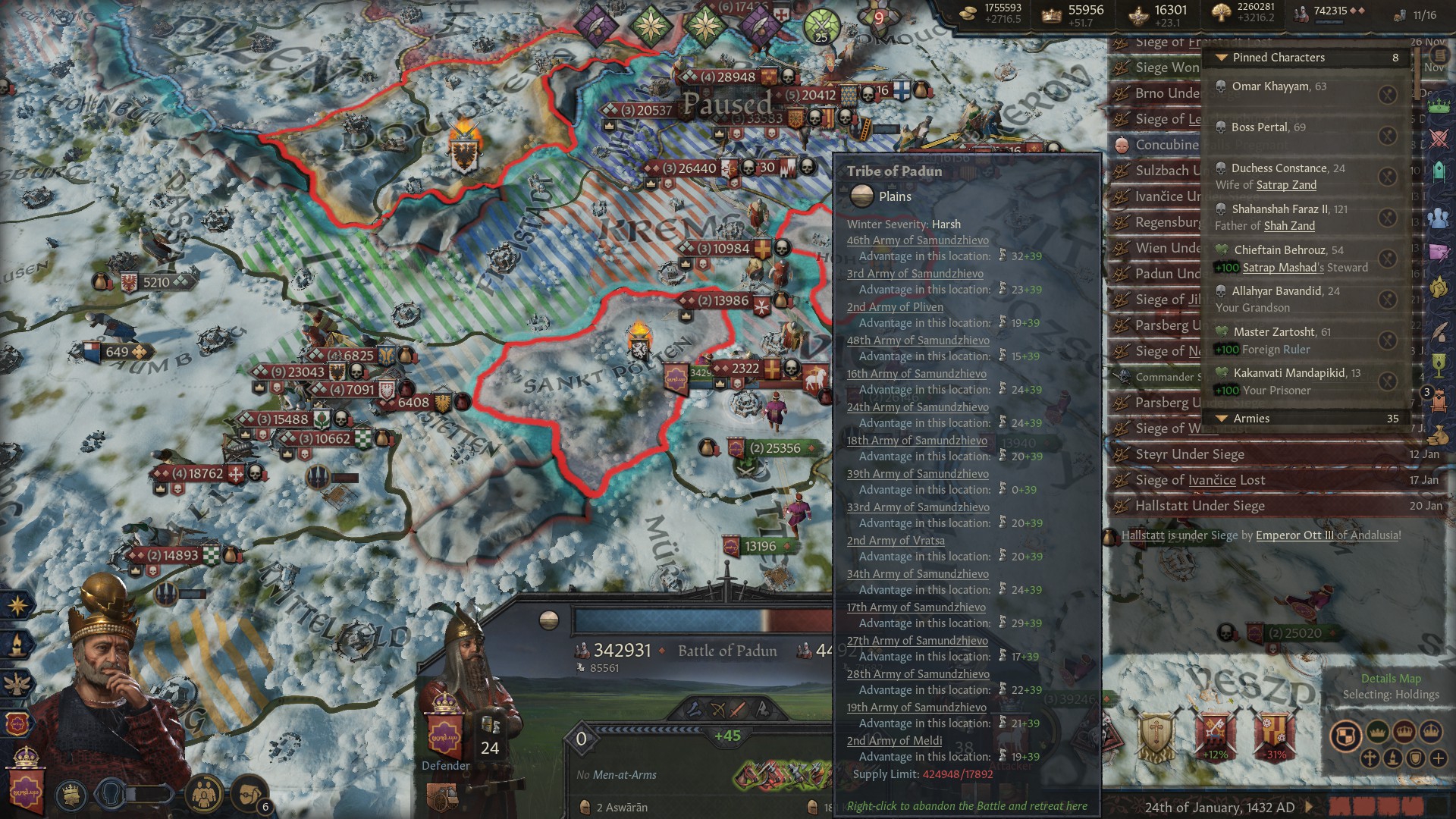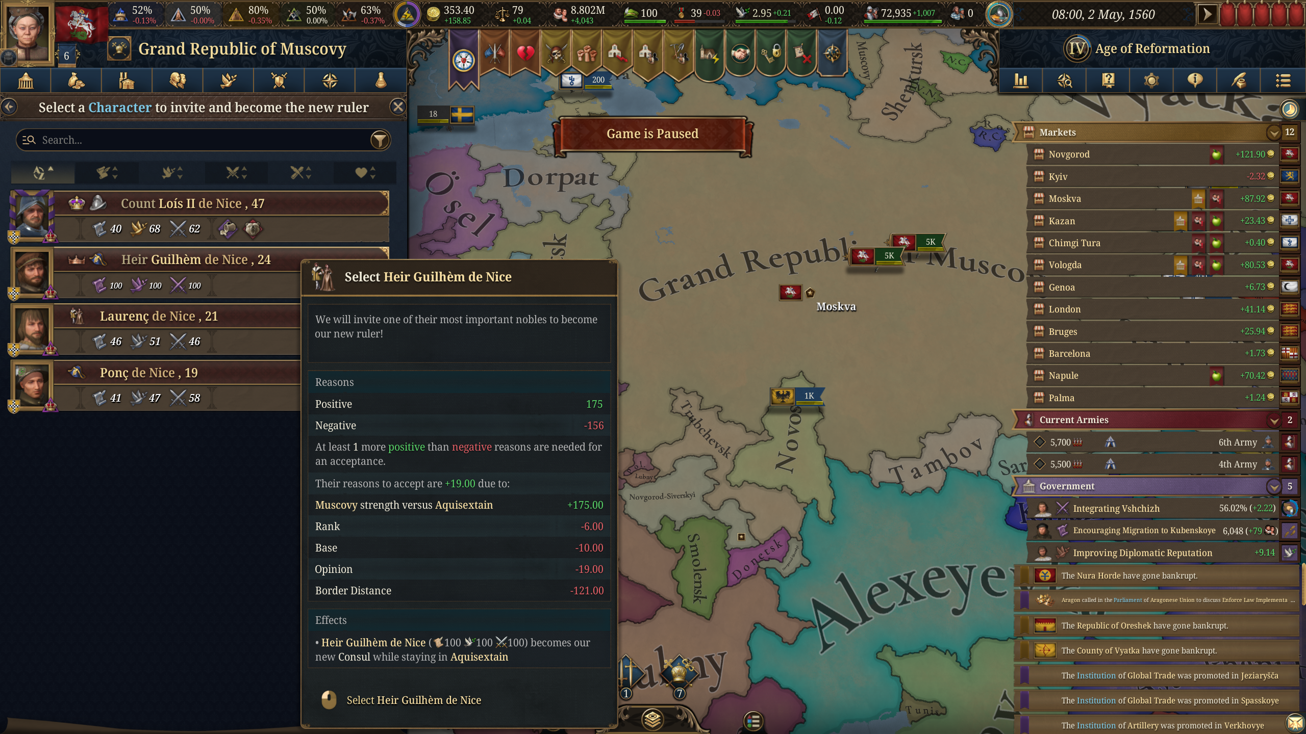 И да, еще плюсы административного правителсьтва. Вассалы без моего ведома не воюют вообще ни с кем. Безопасность при перемещениях всегда 100% и с наследниками проблем нет. Просто накидываешь на самого лучшего наследника голоса и бабки, потом ему переходит все, без каких-либо разделений. Если вырос кто-то покруче, то не беда, голосуешь за нового. Это просто пиздец как ломает игру. Как и бесконечные вассалы, с которыми я могу брать всех советников с хорошими статами по 30+ Игра превратилась в годмод. Экономика растет в сумасшедшем темпе. Как и военная сила. Я даже хз сколько там обычных солдат, мои 3к профессиональной армии настолько набафаны домиками, что они ебашат 30к армию без проблем и потерь, несмотря на то, что всех их перекрыли.