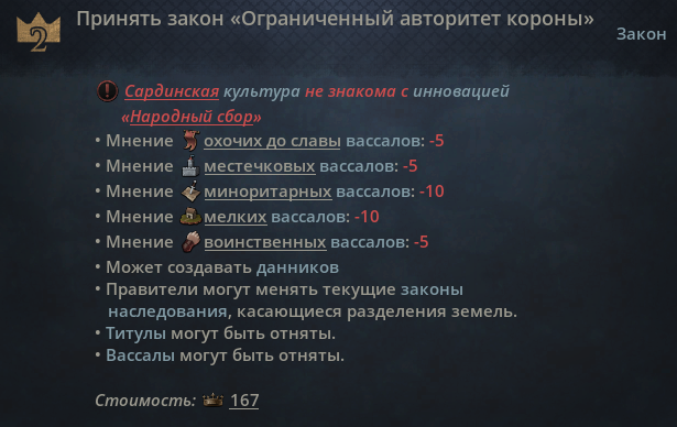 Я не понимаю. Быть герцогом, хоть и независимым, это теперь уровень племени? Когда я в прошлый раз играл, спокойно можно было поменять наследование ещё за 1 правителя. А тут уже второй правитель близок к смерти, и, оказывается, феодальная держава не открыла инновацию народный сбор.