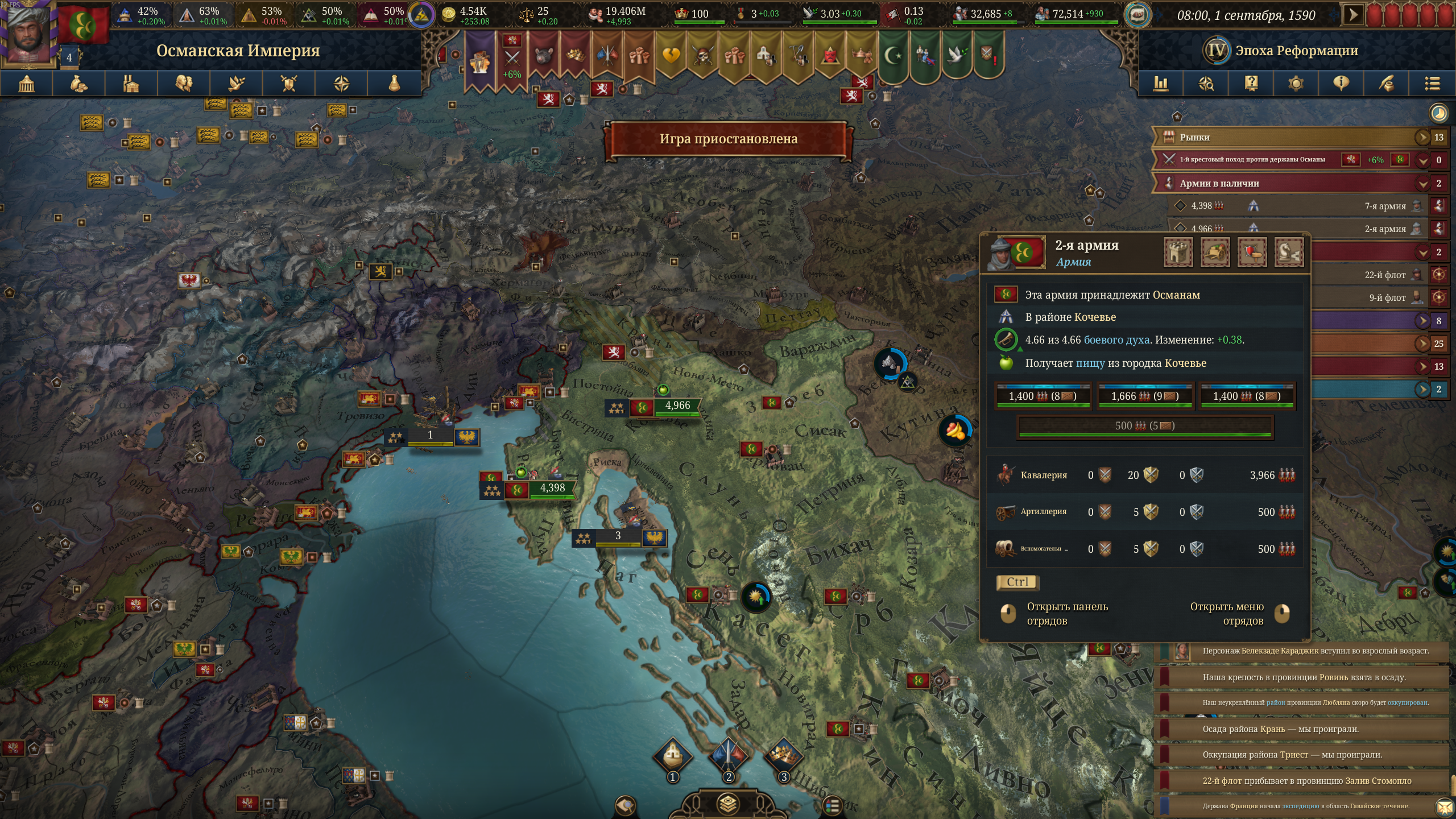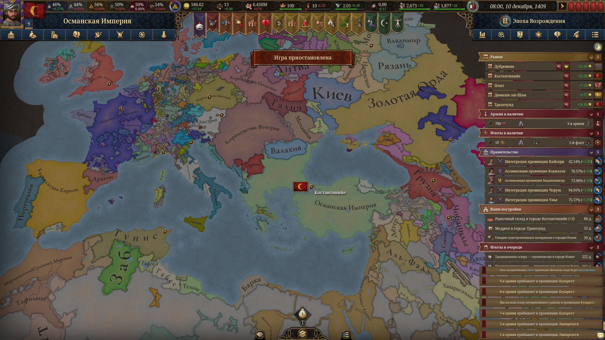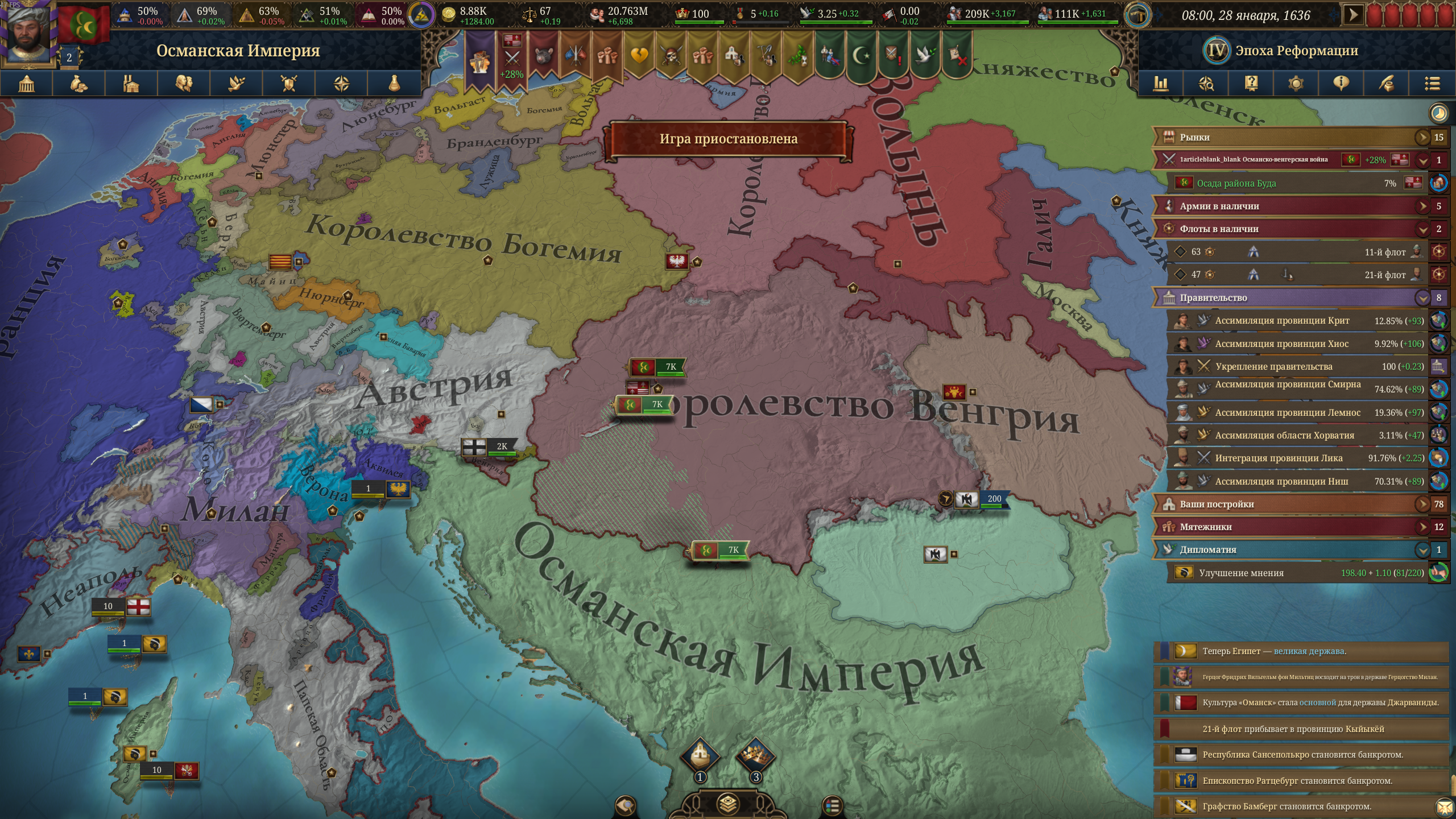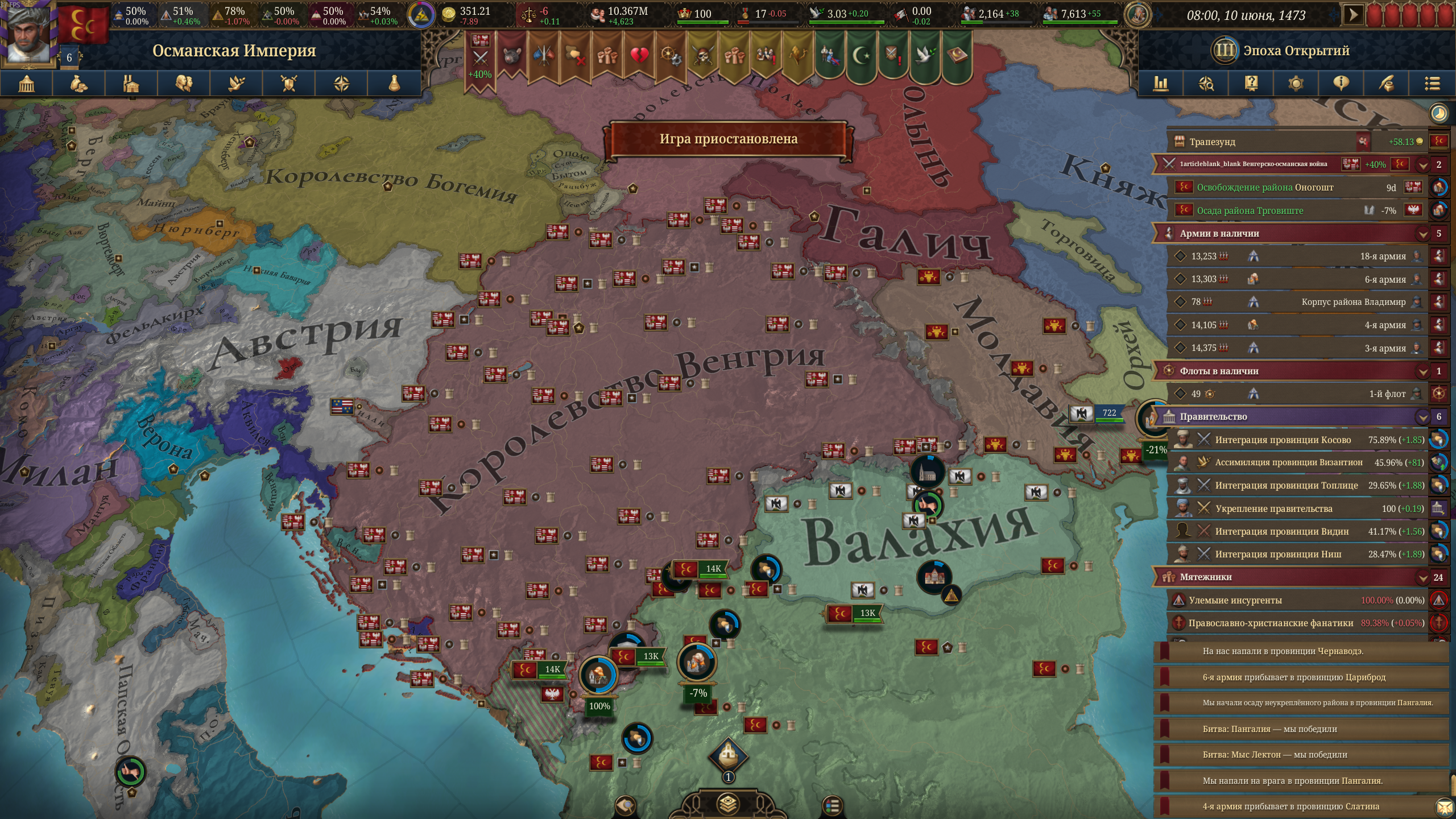 Бот какой-то необучаемый. Венгр уже третью войну мне объявляет и в третий раз теряет территории. Мне одна война осталась до полного завоевания Балкан (ну и плюс разборки с Венецией за три провинции).