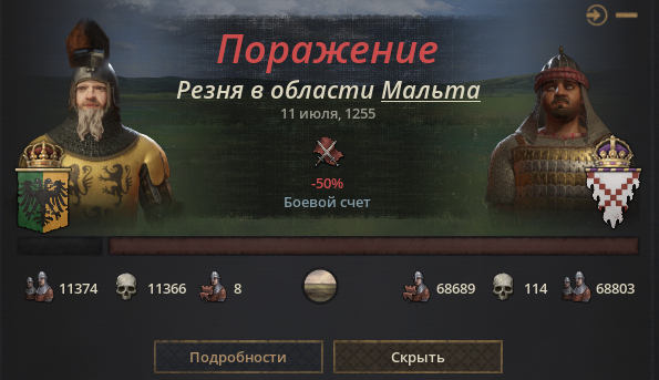 >>50532464 Так Рим был моим, под православием. Союзники в большинстве были на территории Англии, и ещё где то треть где в регионе будущих Нидерландов. По сути большую часть войск врага уничтожил я. Что было не то чтобы сложно, ведь все как зомби перли на Рим. который давно застроил до жопы, и где я и оборонялся. Твой замес канеш выглядит куда эпичнее . Мой то ограничился полуостровом Италии.