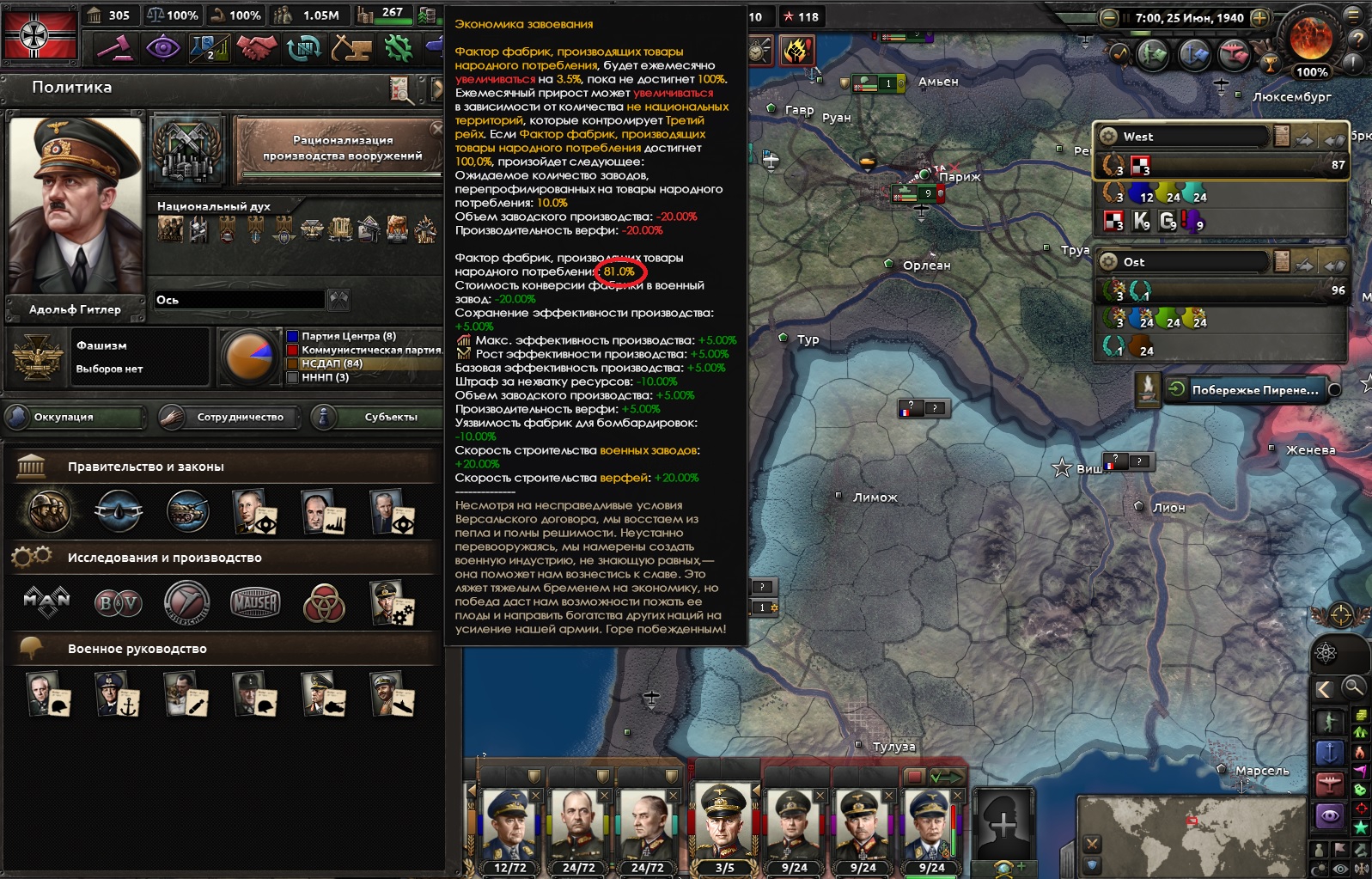 Захватил Францию в 1940 строго по историческому таймингу, а захватить золотой запас не дали. МЕФО уже 81% и даже до войны с СССР не хватит, экономика обрушится раньше. Эти пидорасы на пердоходах полностью сломали историческую Германию, теперь играть вообще не реально.