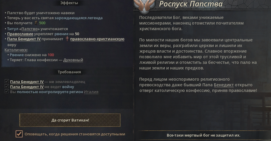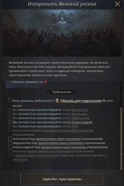 Решение об устранении раскола даже не появляется, хотя титулы мои, и места все под православными владыками. В прошлый раз я завоевал Арабскую империю, и решение появилось хотя и не все пункты были выполнены. >>50531538 Да уже и не хочется особо.