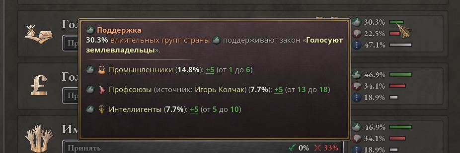Почему мои землевладельцы, сидя в правительстве, обладая сильной поддержкой "Голосуют землевладельцы" не поддерживают этот закон на вкладке законов? Лидер тоже без особенностей.
