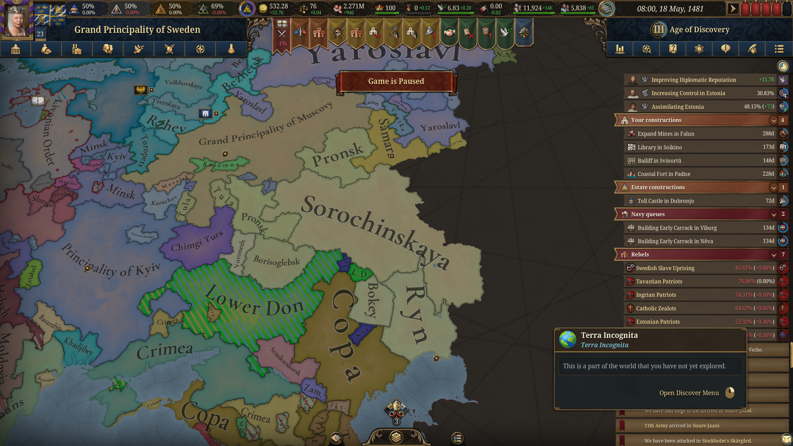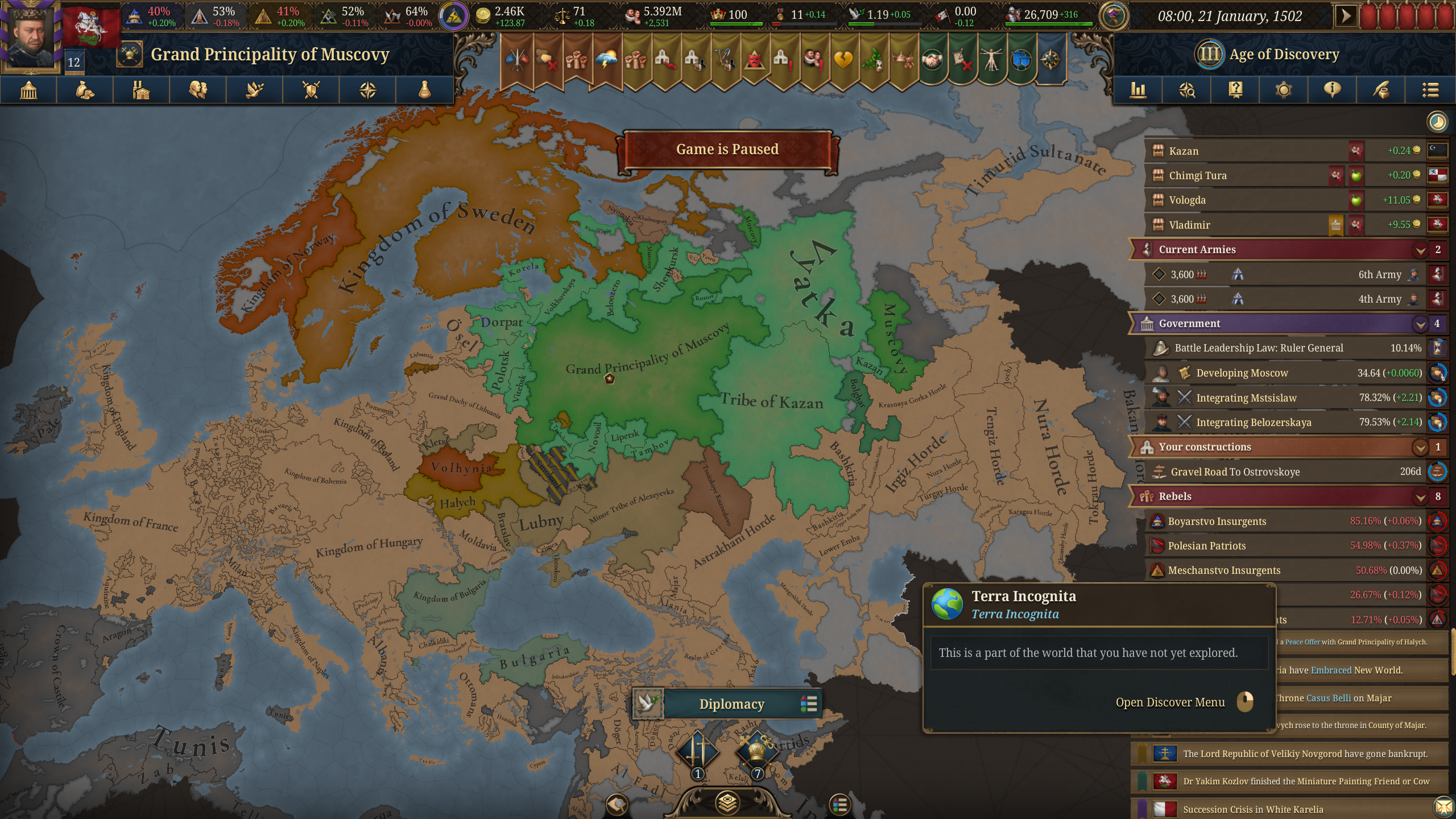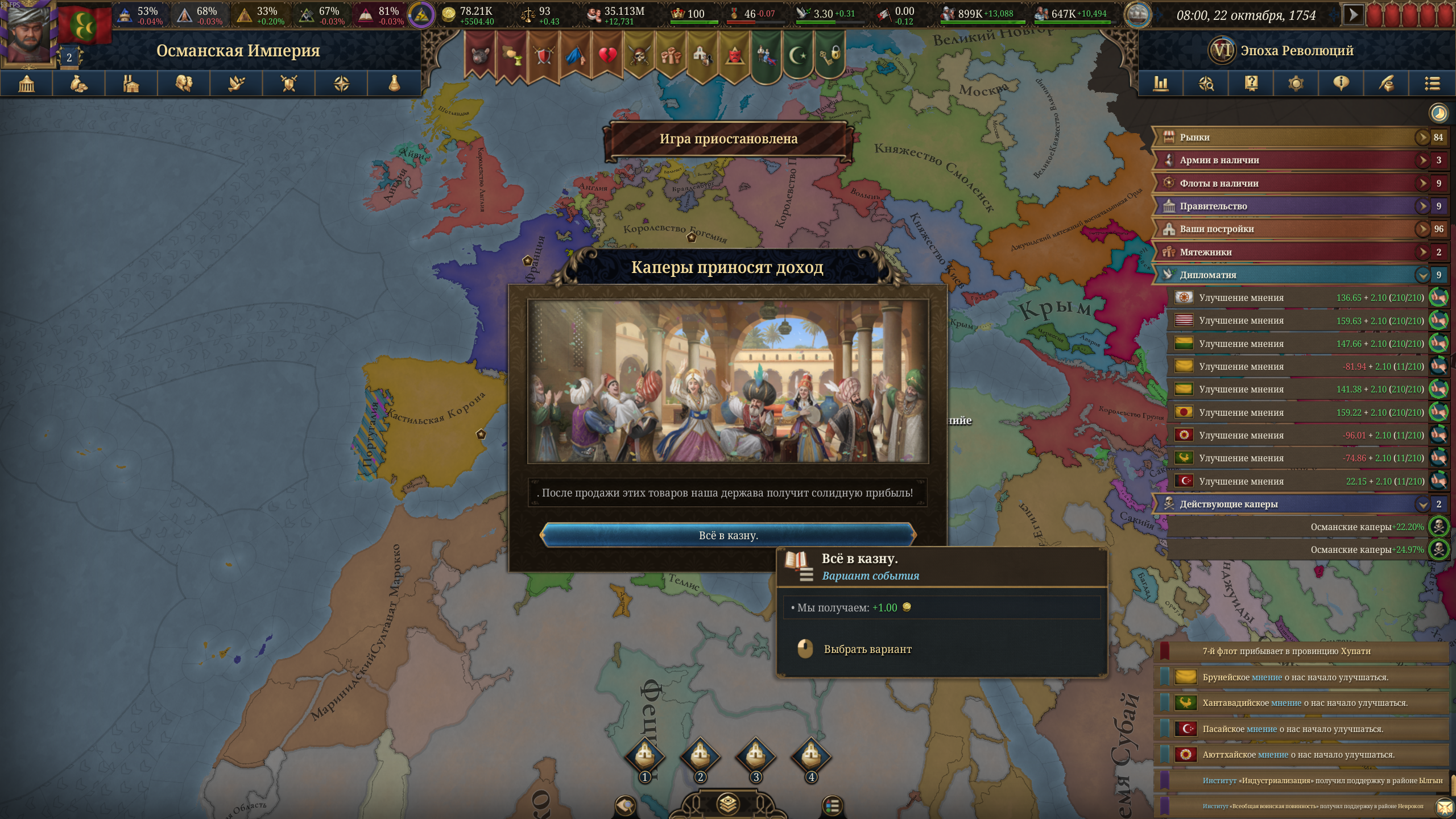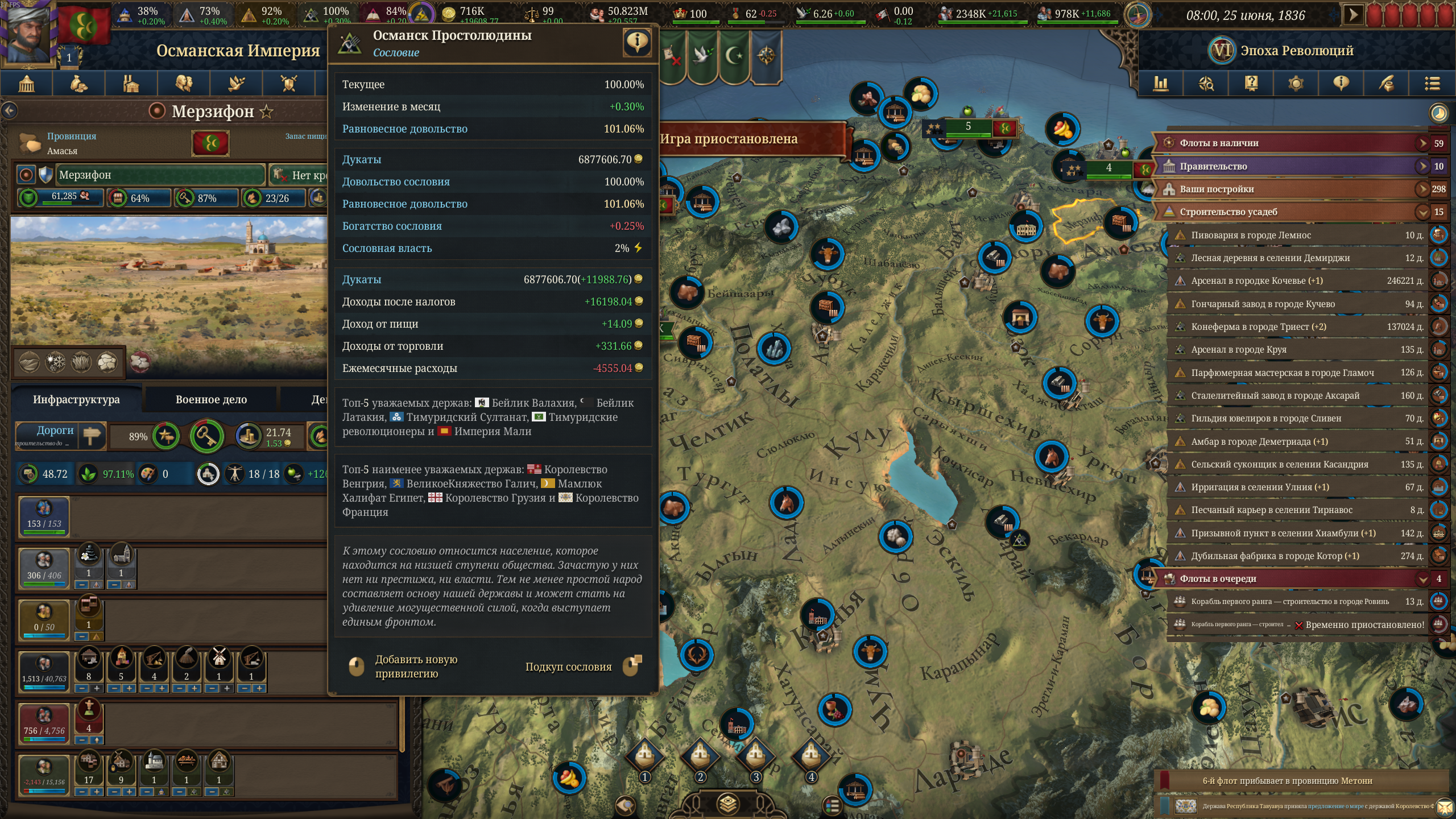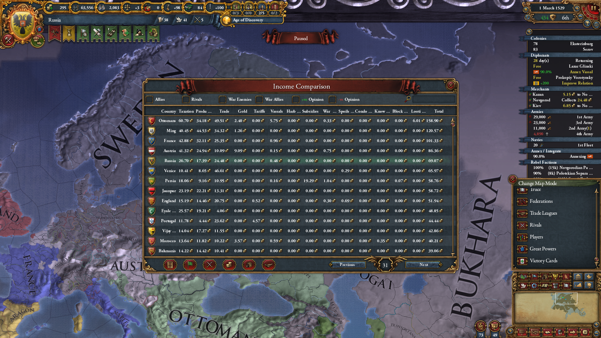 Сформил Россию за Новгород. Без безумства, со старта забил тверь на show strength и потом 20к армией (16к свои + 4к новгород компания) методично по сунь цзы ловил на сожженных провках московские дробленные стаки и их вассалов и уничтожал в оборонительных боях в лесах + за реками и так далее. Суть вот в чем. КАКОГО хуя по деньгам говно? Почему за ТОРГОВУЮ РЕСПУБЛИКУ, уже относительно "широкую", у меня НАЛОГИ выше ТОРГОВЛИ в бюджете? Почему относительно других великих держав я БОМЖАРА, несмотря на то что мол якобы торговый весь такой в шекелях купаться должен? Что я делаю не так? Мануфактуры доступны пока только говенные на зерно и скотину, их и строю в ноде новгород, купцы в киеве, казани и астрахани перенаправляют, в новгороде собирает, белое море просто нахуй забыто (или это ошибка)? Как бы вы тут выкрутили доход по нормальному? А то бред полный, 64-69 рублей в месяц за торговую республику и такую отожранную, и это в 1510-1520-х годах-то!