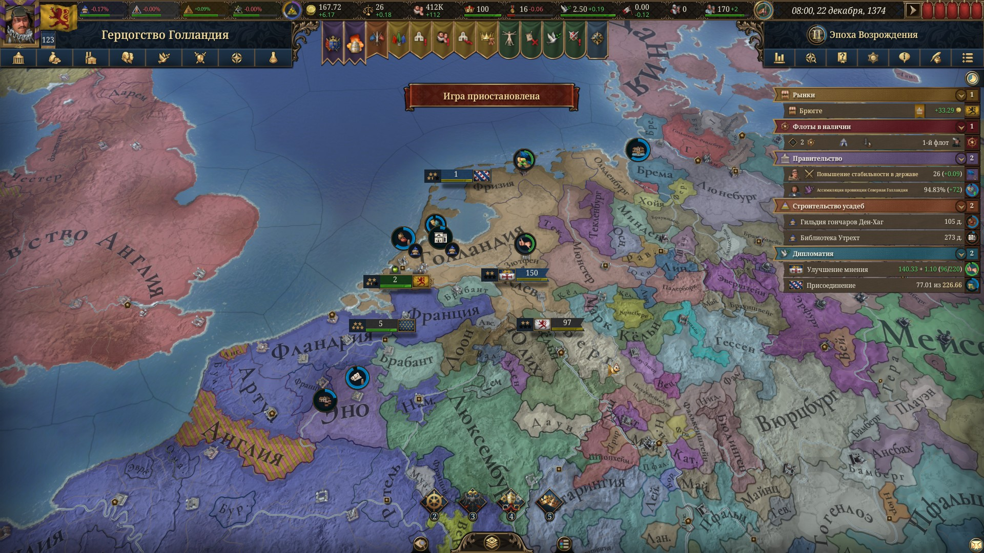 Хотел большую Голландию собрать. И тут Франция осуществляет следующий прикол. Ну и все, мне больше не хочется играть. Я же никогда это не заберу, а зачем в таком случае играть? Поч СРИшка не реагирует на территориальные потери? Хотя плевать, я уже удалил сейв, настолько сильно попа лопнула.