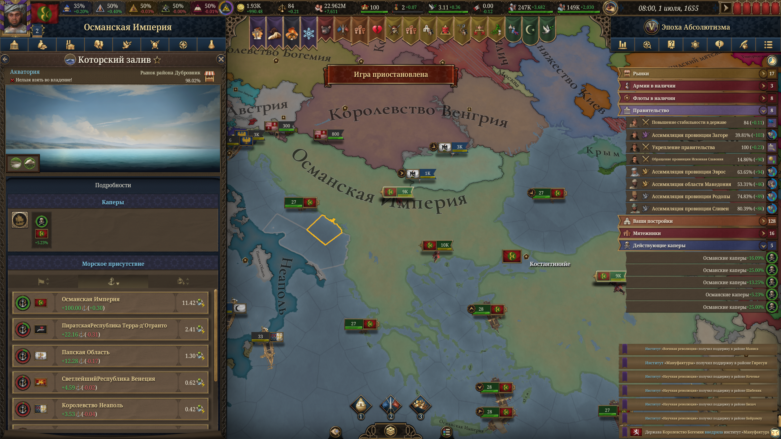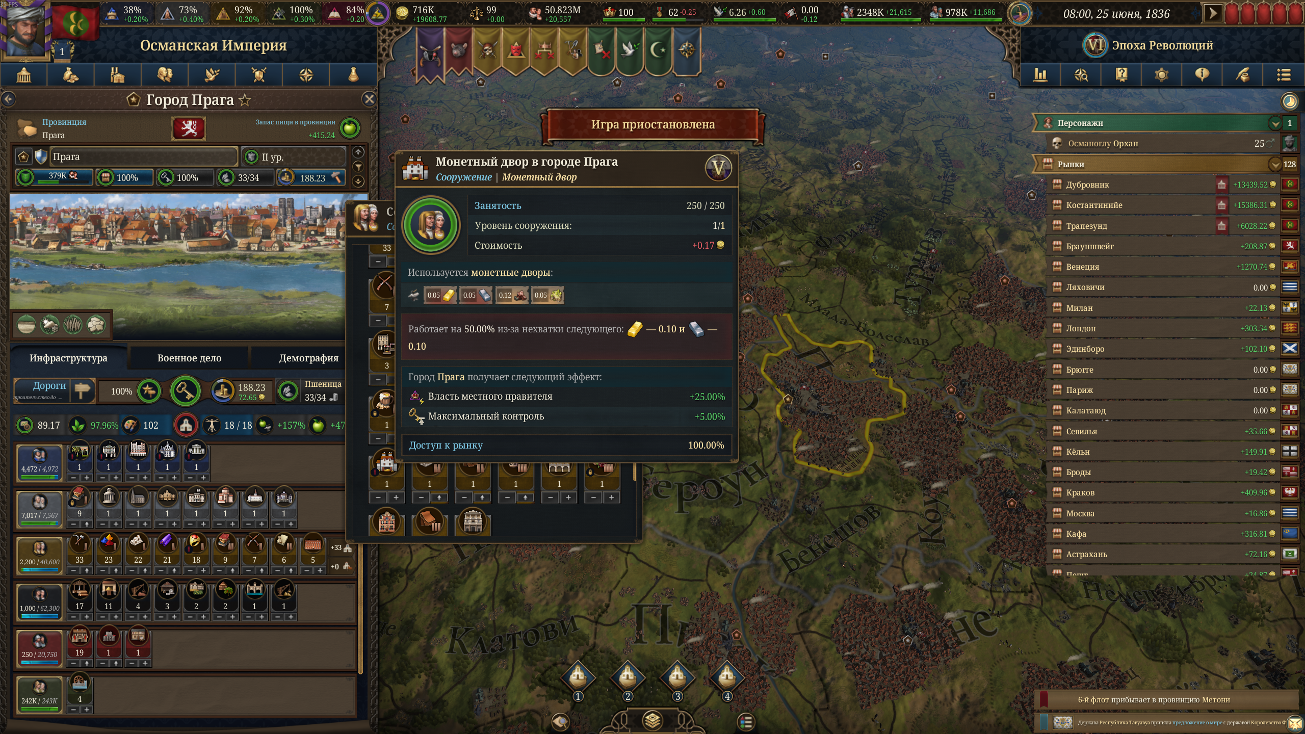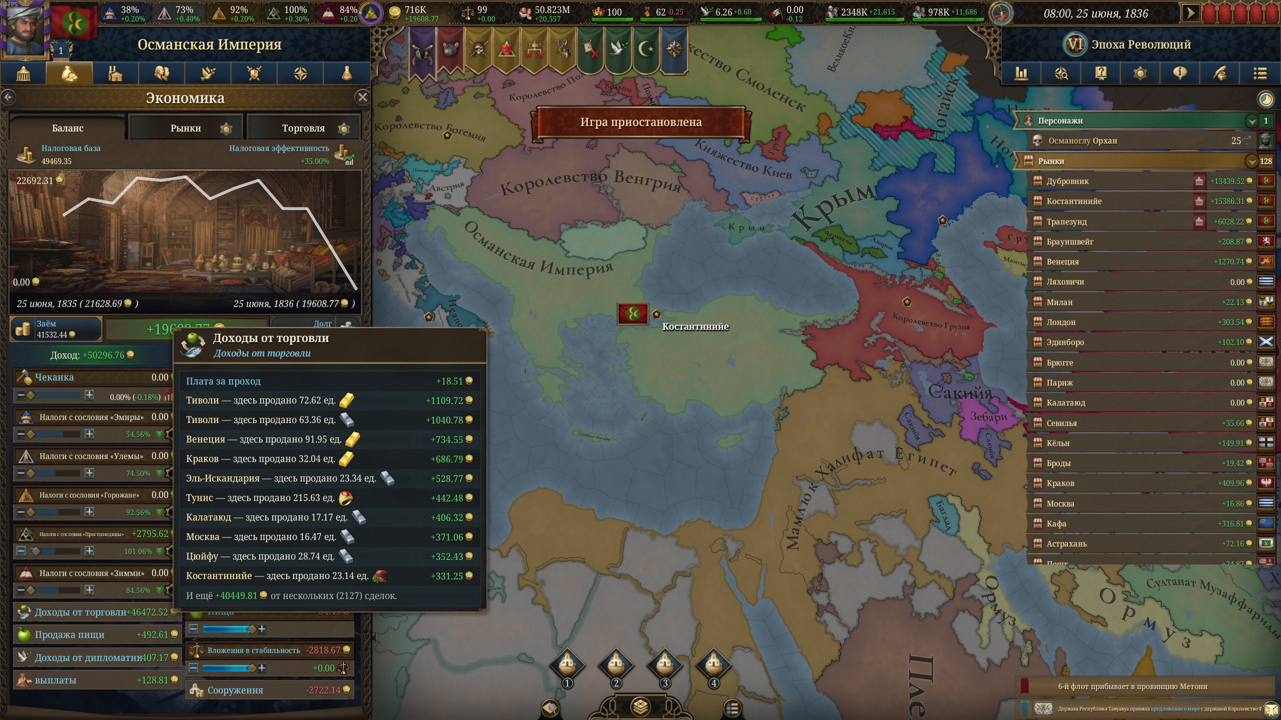 >>50532997 Я не хочу тупо блоббиться красить, какого хуя при УЖЕ имеющихся провках и так далее, у меня общий доход 69, при этом налоги ВЫШЕ торговли (за республику торговую!), при этом контроль новгорода 80%+, казани столько же, киева где-то 40% что ли не помню, астрахани тоже не мало, так какого хуя я НАСТОЛЬКО бомж по меркам других стран? Мануфактуры зерновые и коровьи построил везде где мог (в основном нод новгород свой же). Ну бред полный же