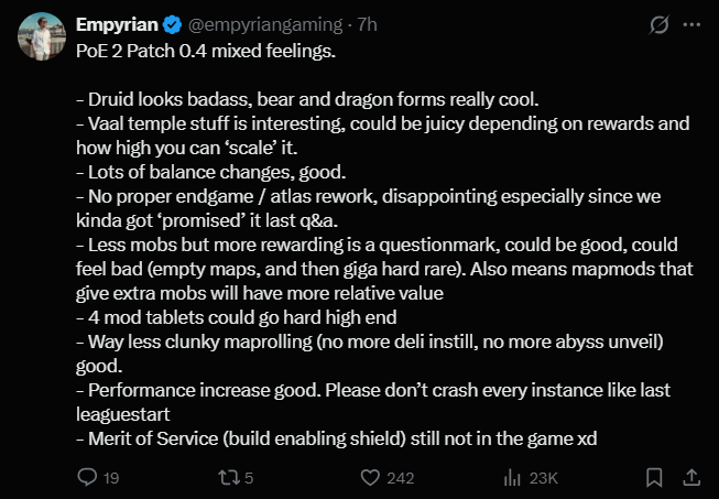 >делириум дающий паксайз и лут уебали >общий паксайз нах послали >кванту с табличек обоссали >все боссы теперь имеют снижение входящего урона в течении 15-20 секунд >друид медленное комбо дерьмо для аутов чей потолок белые т4 мапы и для них такой геймплей это ахуенчик самое то на недельку >крафт ослабили удалением некоторых оменов и ослаблением эссенций >рарити понерфлено + в 0.5 будет полностью удалено