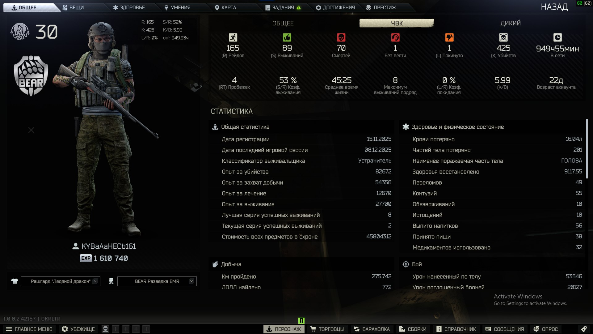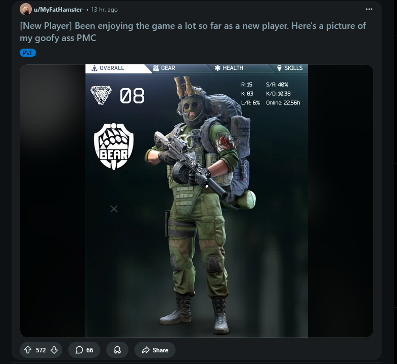 >>50527458 > если сложно то иди в ПВЕ Плохой совет. ПвЕ вырабатывает отвратительные привычки от которых потом тяжело отучаться и будешь страдать в пвп. ПвЕ не даст реального опыта игры, но создать ложное впечатление об игре и наработает вредные навыки. Изучать карту, квесты и выходы можно в режиме тренировки где нет врагов и так далее. Но именно ИГРАТь нужно сразу в ПвП. Вот, например, мой ПвЕ профиль. В пвп я был абсолютнейшим слабаком и казуалом, который еле-еле выживал и еле убивал ботов. ПвЕ СЛИШКОМ лёгкое по сравнению с ПвП и заставляет тебя чувствовать себя супергероем, что потом будет ОЧЕНЬ вредно в пвп.