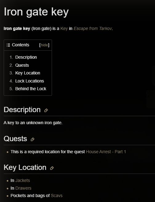 Неэкипируемый лут, в примечаниях указано если он используется в качестве бартера, требуется по квестам или нужен для апгрейда Убежища: https://escapefromtarkov.gamepedia.com/Loot
