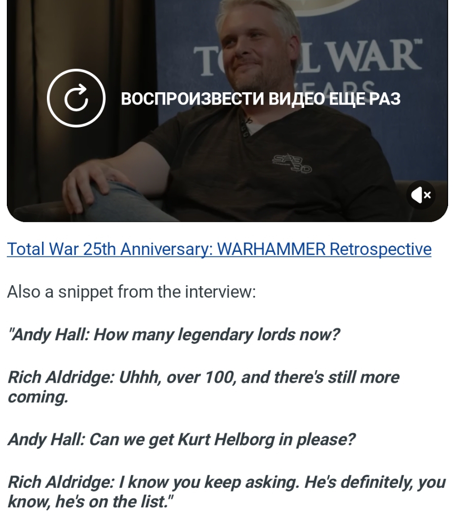 >>50538164 Бориса, наверное, не будет. Ну тип и так он в игре, как ты его продашь. Там какой-то жрец Ульрика или кто есть в ЛЛы, ну лороведы знают. Хотя да, неплохо бы Бориса и Красного Герцога у вампиров доработать и в полноценные ЛЛы оформить хотя бы для конфедераций, если не хотят играбельными фракциями их делать.