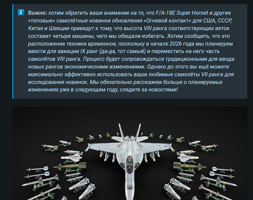 >мы планируем ввести для авиации IX ранг (да-да, тот самый) и переместить на него часть самолётов VIII ранга. Процесс будет сопровождаться традиционными для ввода новых рангов экономическими изменениями. Успейте прокачать короче.