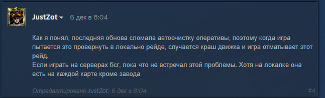 >>50542020 у меня проц такой же лол, настройки у меня ниже. текстуры высокие, но переходил на средние - проблема та же, вернул. был момент - в этом вайпе настройку света какого то света поменяли, название не помню. было раньше вкл\выкл, а щас выкл - низкие - средние - высокие. попробовал вырубить - на резерве досидел до красного таймера, а потом в лесу вылетел. просто заметка тест памяти чисто виндовый делал, не было проблем, но думаю он и не легитимный кстати авто очистка в клиенте игры по моим ощущениям может заруинить, потому что бывает что она очищает память, но потом игра вылетает ещё не успев занять всю память в общем к сегодняшнему дню я поставил Intelligent standby list cleaner ISLC, вручную задал файл подкачки на диске винды 8-32гб что сделать ещё я не знаю, у меня пока нет идей, но вчера перед сном на развязке видел что процесс таркова занимал такой порог, при котором обычно вылетало уже в крайнем случае я буду бегать большие карты на серверах бсг, я заебался это дебажить 2 дня, попробую потом написать в тех под им, мб высрут чё нить