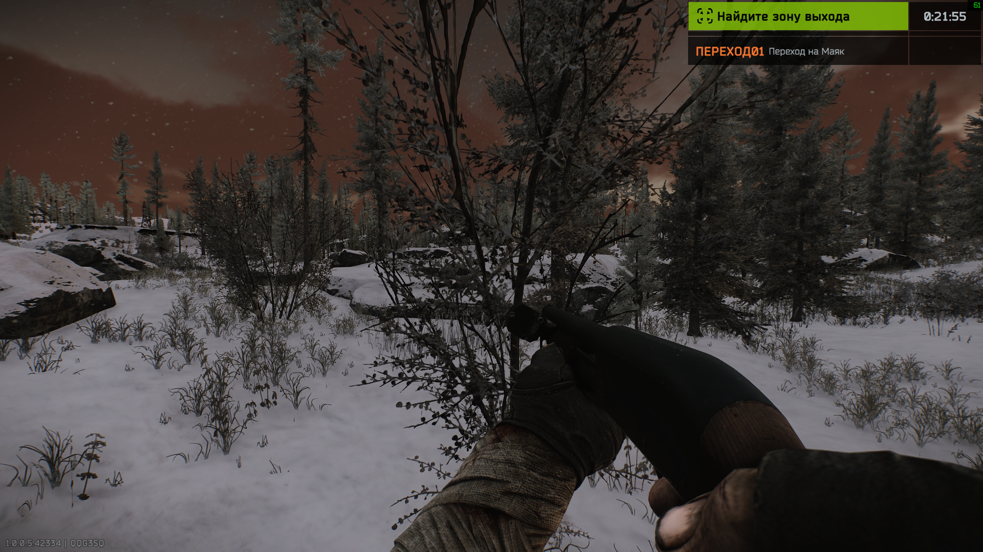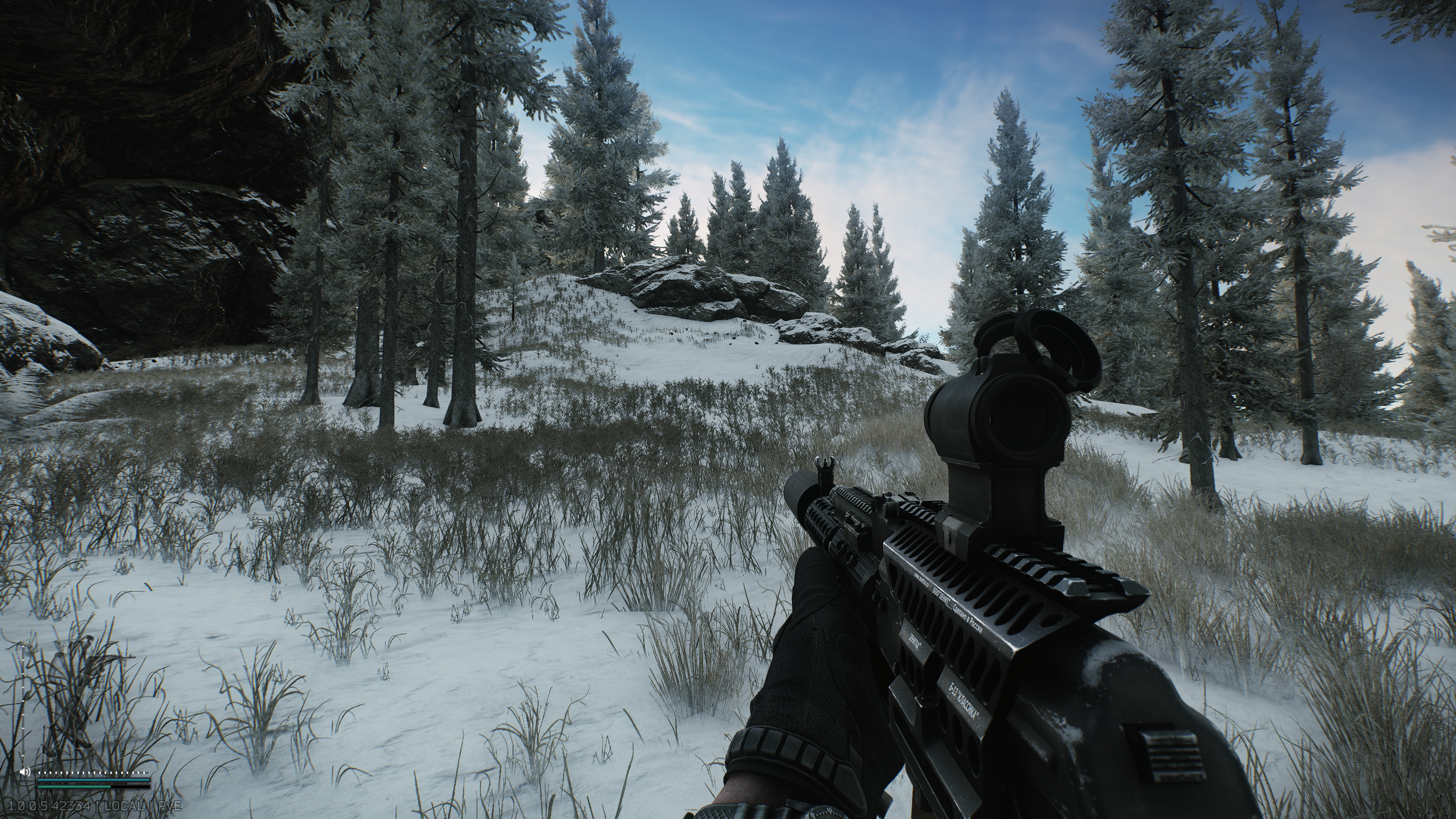 Как же хорошо со снегом. Видно лучше. Но всё одно, листва не опала и при должной маскировке можно так же сидеть в кустах. Кстати вместо хруста какое-то шорканье будто снег лежит при минус 30, а водоёмы не замёрзли... должен быть ХРУСТ.