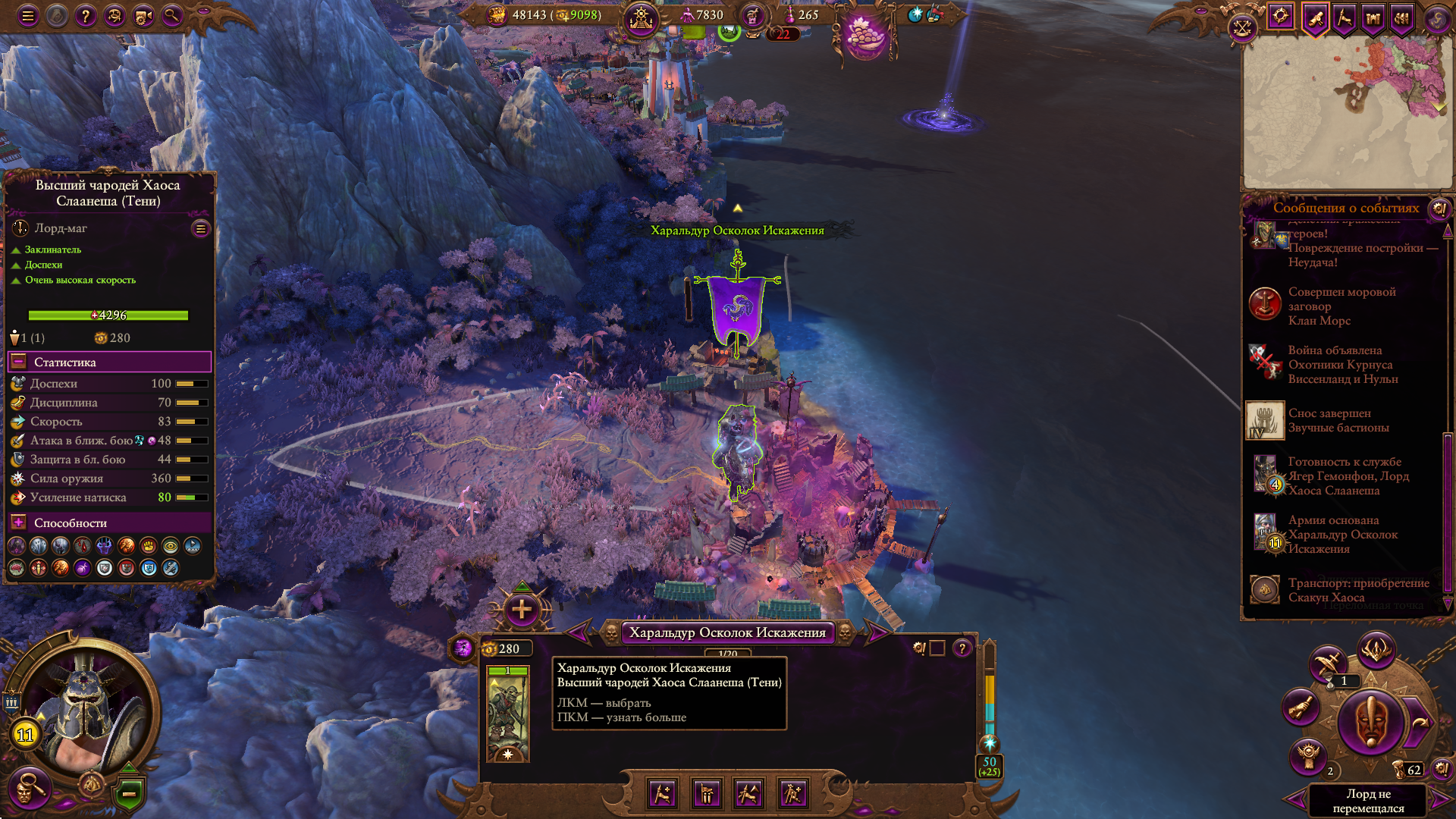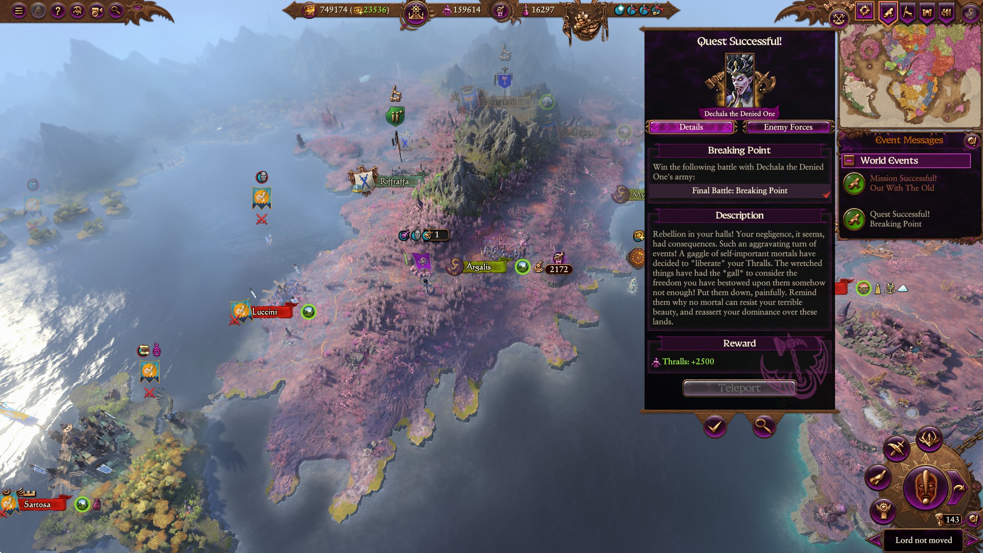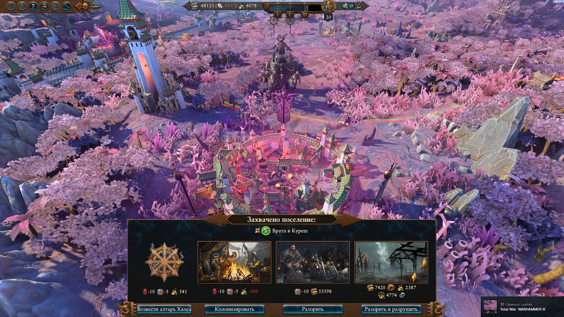 Наконец-то добрался до финальной битвы, это массовый заруб против объединенных сил Катая, Империи, Бретонии и эльфов. Изи конечно на этом этапе. Награда немного потешная, эти коррапты и так копейки стоят, нах мне их ещё удешевлять, странный с ними баланс какой-то.