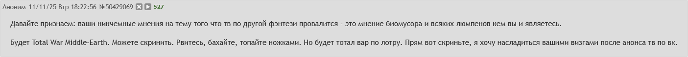 Бедному историчушку уже так вахой дымоход продрали, что он готов забить на историю и молиться на любое другое фентези, лишь бы не ваха. Лотр, звездные войны - ваще похуй, все сожрет с радостью лишь отомстить вахе на смертельную обиду! Представляете себе этого долбоеба с обидой на игровой сеттинг?
