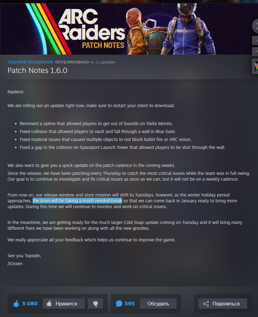 Ладно, что завистливые маньки горят с успешных разрабов это мы уже поняли, но никто так и не объяснил почему они должны работать в праздники? Я понимаю игра была бы забагована как киберпанк на релизе и надо было бы срочно ее спасать, а щас-то нахуя? Критические вещи пофикшены, все работает. Какой смысл?