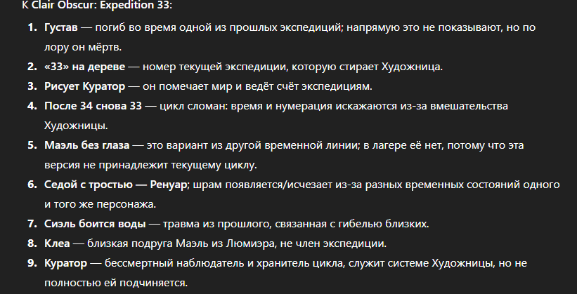 >>50657369 >Нарисованный Ренуар был в курсе всех раскладов с нарисованным миром, кто его стирает You still believe this world ends because it must? It ends because someone decides it should. >кто такая Маэль? You don’t belong to the others. >почему он просто у монолита не открыл правду команде? If I tell you now, you won’t reach the end. Truth isn’t always progress. >Если же нет, то почему он не добил остатки экспедиции Он до последнего хотел убедить Версо вернуться обратно к семье. А если бы грохнул Маель с самого начала, то мог пробудить её силы и всей его нарисованной семье настала бы пизда.