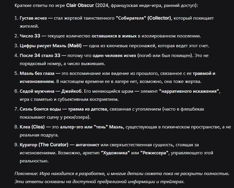 >>50558627 >1. Куда делся Густав? Его забрали писатели в роман про вампиров. >2. Что значат те цифры 33 на большом дереве вдалеке? Последний день декабря. >3. Кто их рисует? Кузнецы. >4. Почему после 34 нарисовали 33, должно же быть по порядку 35. Игру делали гуманитарии, забей. >5. Почему однажды показали Маэль без одного глаза, куда она делась и почему её в лагере нет? Это Маэль , которая попала на подрастковую зону. В лагере нет потому что ушла в экспедицию. >6. Почему седой мужик с тростью (кстати, как его зовут?) то с шрамом, то без шрама? Рафаэль, вроде. Зависит от того надел кольцо или нет. >7. Почему Сиэль боится воды? Потому что деревенская, у моря не жила. >8. Клеа это подруга одноглазой Маэль или кто вообще? Да, вместе сидели. Но Клея сотрудничала с кузнецами и вышла по УДО, поэтому Маэль её не любит. >9. Кто такой Куратор? Смеагорл.
