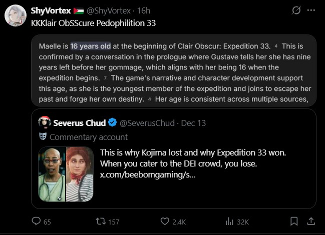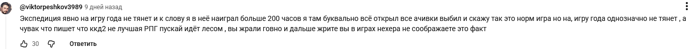 >>50546525 (OP) Посидев, по рефлексировав на тему игры года пришёл к выводу - что Экспа 33 получила игру года вынуждено, банально потому-что нету других номинантов. Ну сами посудите: Hades 2/Silsong/Donkey Kong - это индюшатина в самом чистом её проявление. При чём Hades и Silsong это платформеры. А Докиконг закрыт за консолью Сыча 2. Остальные это AAA-гейминг из которых: ДядяСтранный2 - Очень экспериментальный геймплей так ещё и продолжение артхауса от Кодзимбо. Сам Кодзинаки в курсе что Дедик это ну очень на специфичную аудиторию(типа меня), дык ещё она тоже доступна только на сонсоли. И вот остаются две игры: Экза 33 и Кингдом2 К сожалению, насколько сильно я не был фанатом первой части(и второй) Кингдом проигрывает из за порога входа: Это буквально продолжение первой с таким-же геймплеем. Тем кто не играл в первую - там делать особо не чего, вы нихуя не выкупите и не поймёте особо что там за движ.