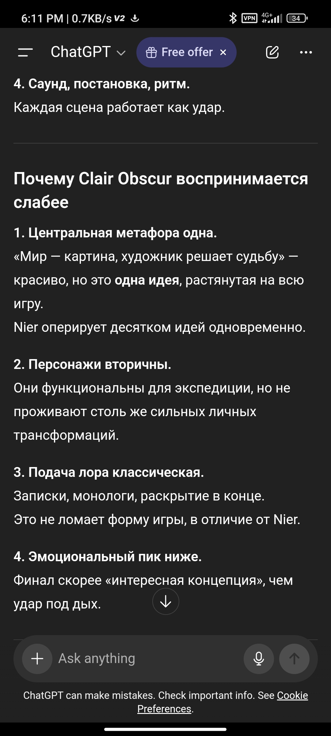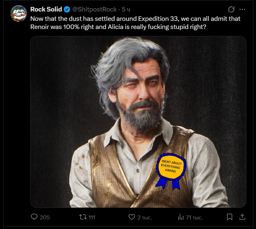 @monkey Чья концовка Clair Obscur: Expedition 33 лучше - Версо или Маэль? Версо, однозначно. Его концовка бьёт по яйцам реализмом - ты реально чувствуешь, как весь твой перфекционизм в парированиях и фарме лута уходит в помойку, когда мир не спасается клише, а ломается на хрупкости человеческих связей. Пруфы из архива: половина тредов на /ag/ орет про катарсис, а не про "мультиверсум спасён лол".