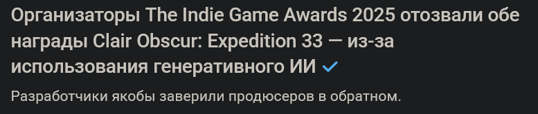 1️⃣Clair Obscur: Expedition 33 — 436 наград; 2️⃣Elden Ring — 435 наград; 3️⃣The Last of Us Part II — 326 наград; 4️⃣Baldur’s Gate III — 288 наград; 5️⃣The Witcher 3 — 281 наград.