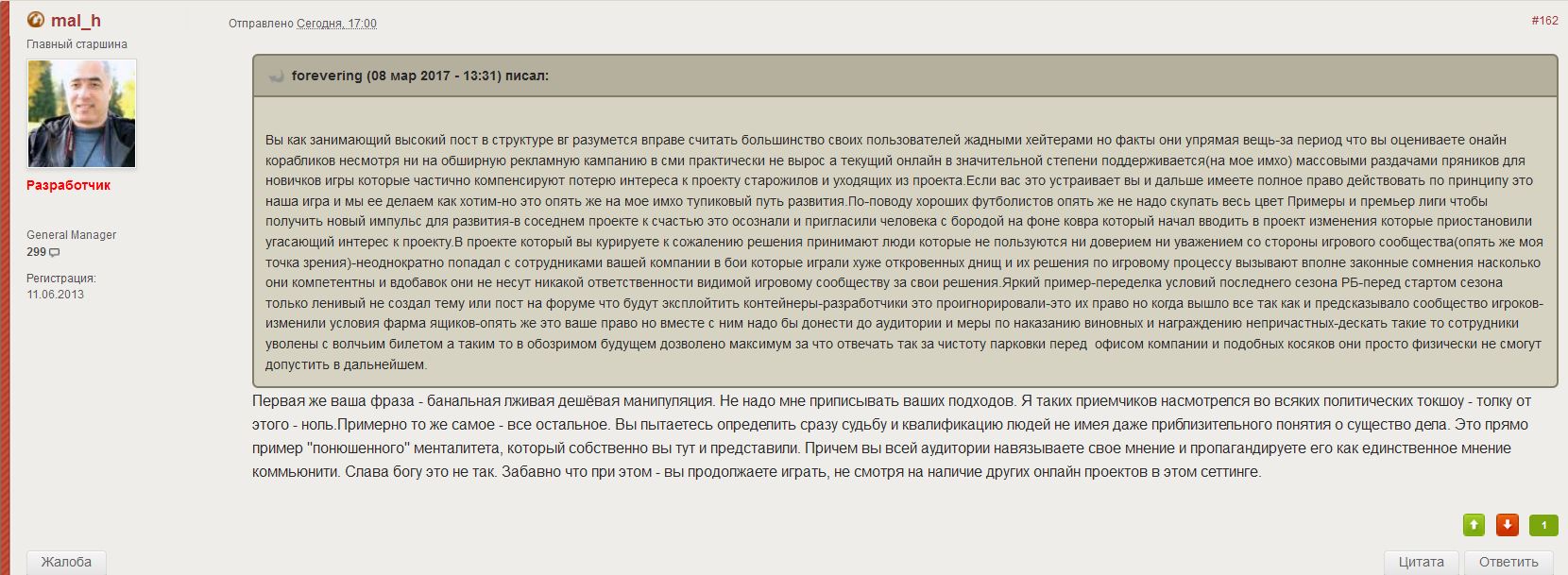 Официальный форум года с 2019, если не раньше, получил название "стерильный", но на самом деле недовольные комменты там тёрли с самого начала, я закатился в проект в 2016 ради ARP-лодок и бугуртнул на форуме, как мол хреново, что ивент кончился и лодки никак не получить, ухажу -- потёрли. Лодки, кстати, в итоге все со временем потом получил.