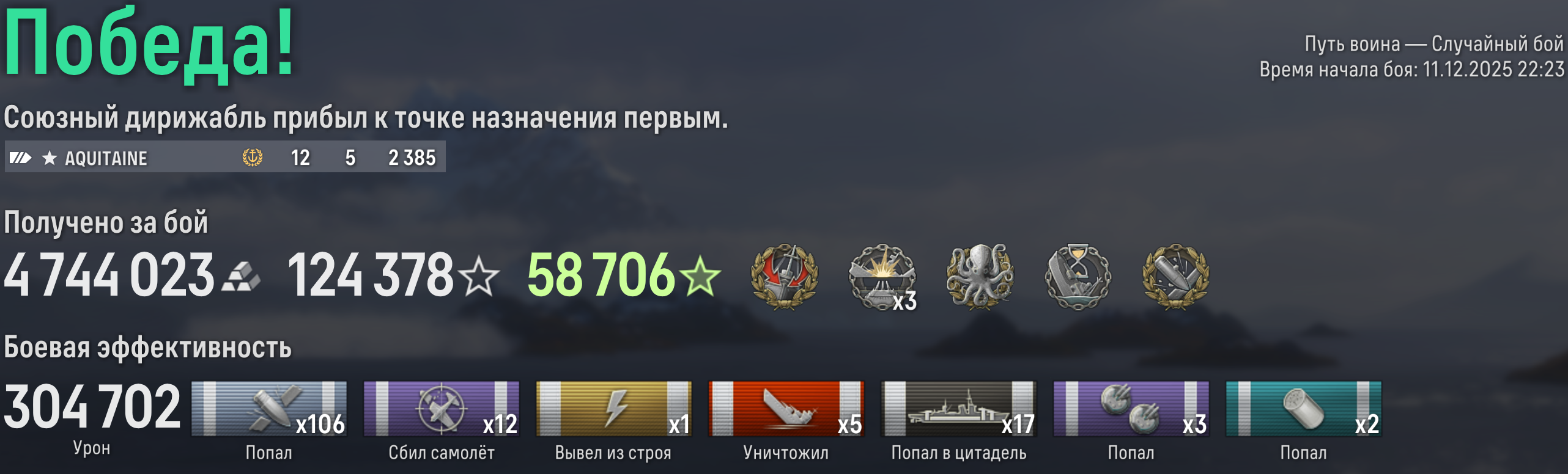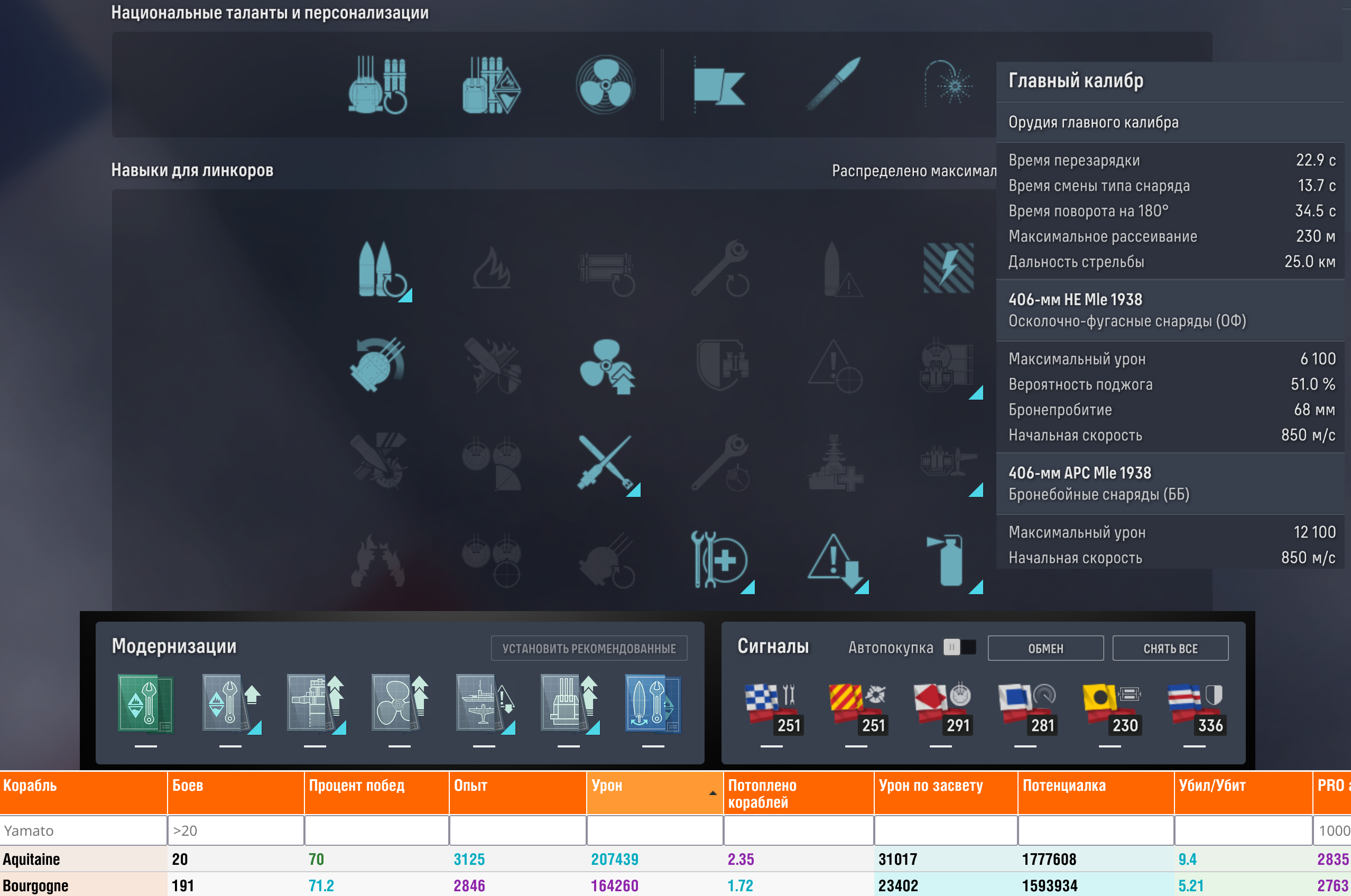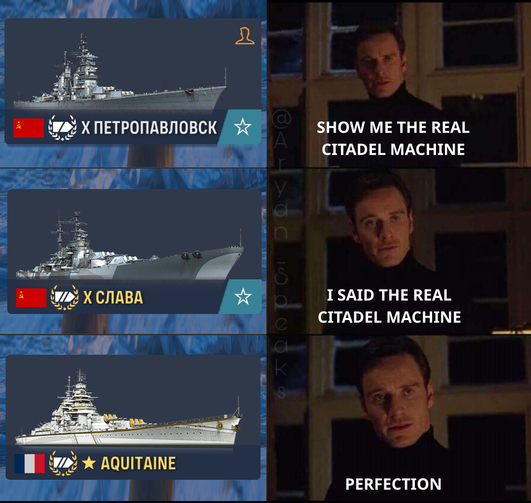 - накинули 10к хопэ - ГК стал точнее (с базовым модулем на 7% дисперсия составляет 230 метров на 25 км, для сравнения у предшественника 277 метров, у Ямато с легмодкой 231 на 26.6, только вот баллистика Аквитани намного настильнее) - добавился оверматч 27 мм - сильно вырос поджог, аж до 51%, что для данного калибра просто запредельно - добавилось скорости, с перком и форсажем едет 43 узла, если прокнет талант легендарного командира на 2 ляма потенциалки, то и все 46 (а это ведь линкор!) - за счёт уменьшения числа стволов в башне улучшились углы наведения кормовой при стрельбе вперёд, и для передних башен на кайте - с модеркой, которую поставил я (на снаряжение и рули), перекладка 13 с небольшим секунды, как у БКРа - ну и биборан, который иногда может доставить (видеорелейтед), хотя применяется довольно редко